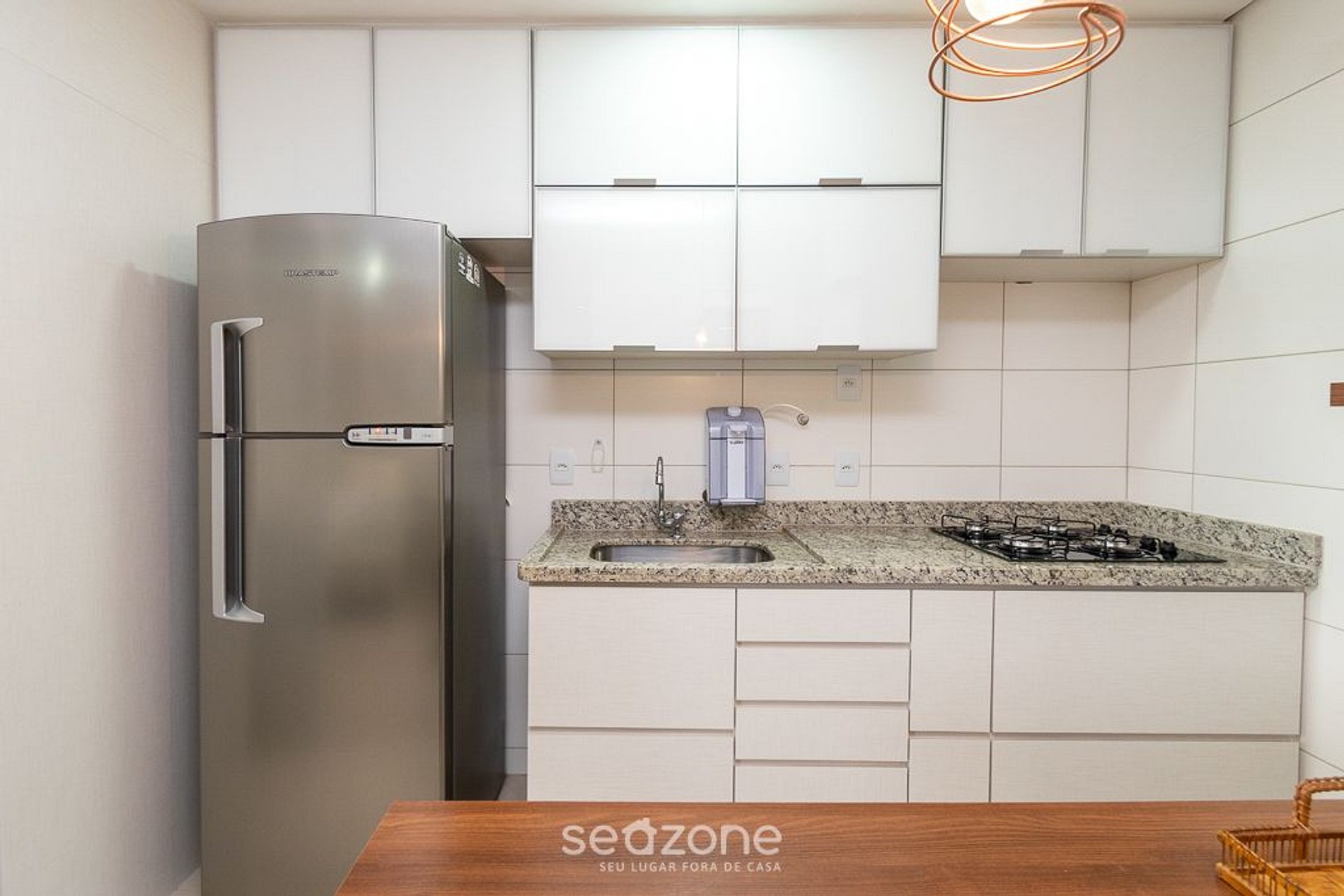 - Cozinha completa com geladeira, cooktop, micro-ondas, liquidificador, taças de vinho, panelas, louças e utensílios;