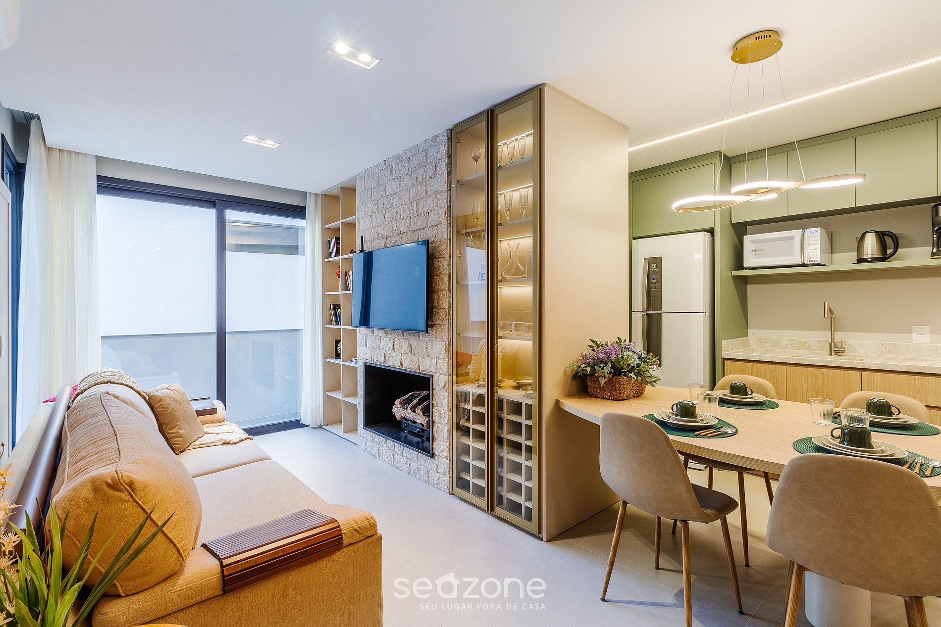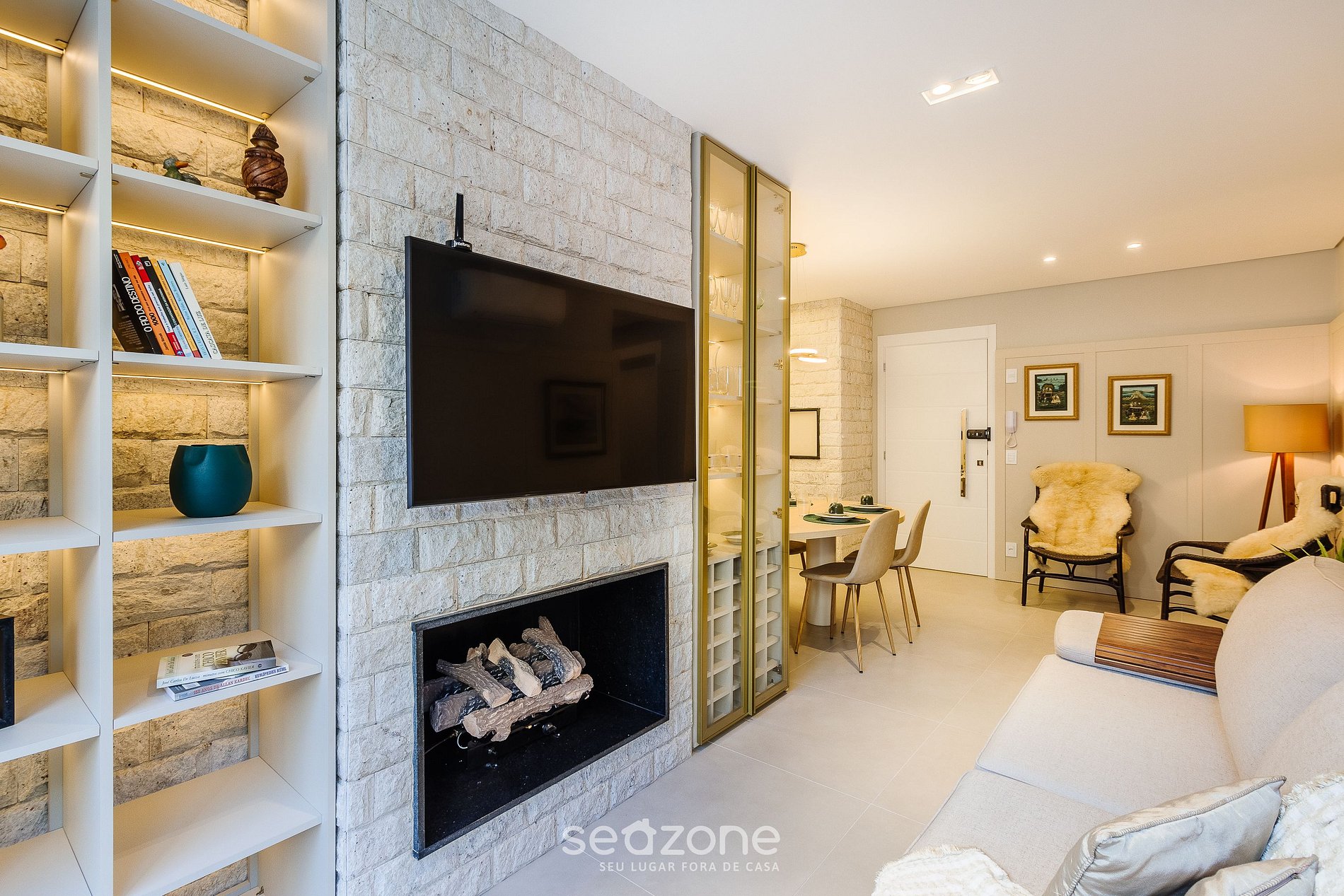 - Sala de estar com sofá, smart TV, lareira interna e ar-condicionado;