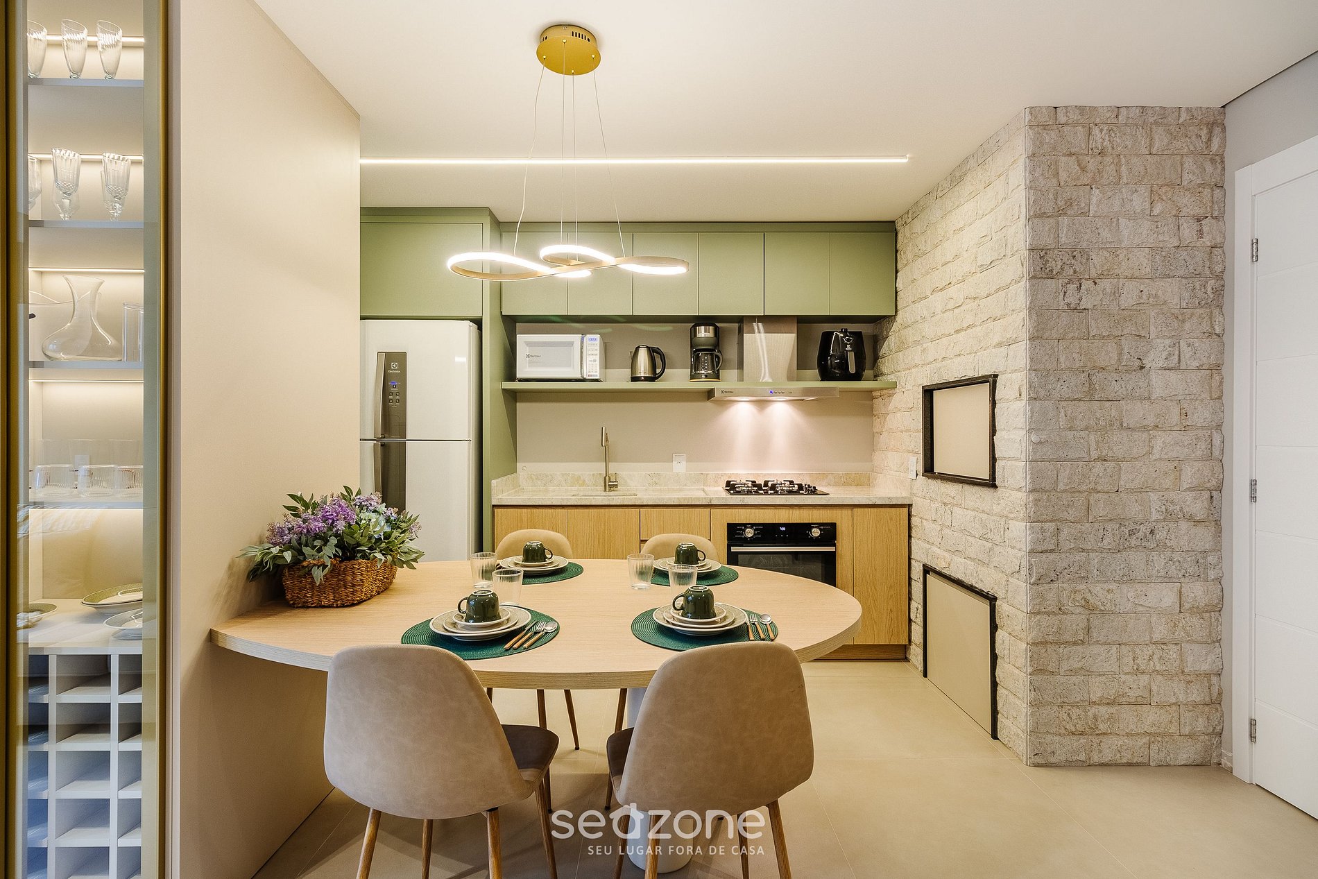 - Cozinha com geladeira, freezer, fogão cooktop, airfryer, forno elétrico, micro-ondas, sanduicheira, cafeteira, chaleira elétrica, liquidificador, taças de vinho, panelas, louças e utensílios;