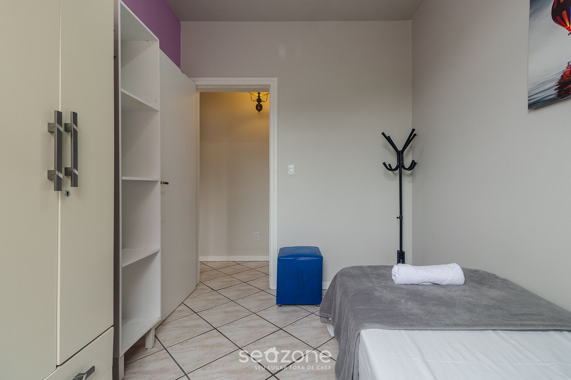 - 1 Quarto com cama de solteiro, armário e ventilador portátil;