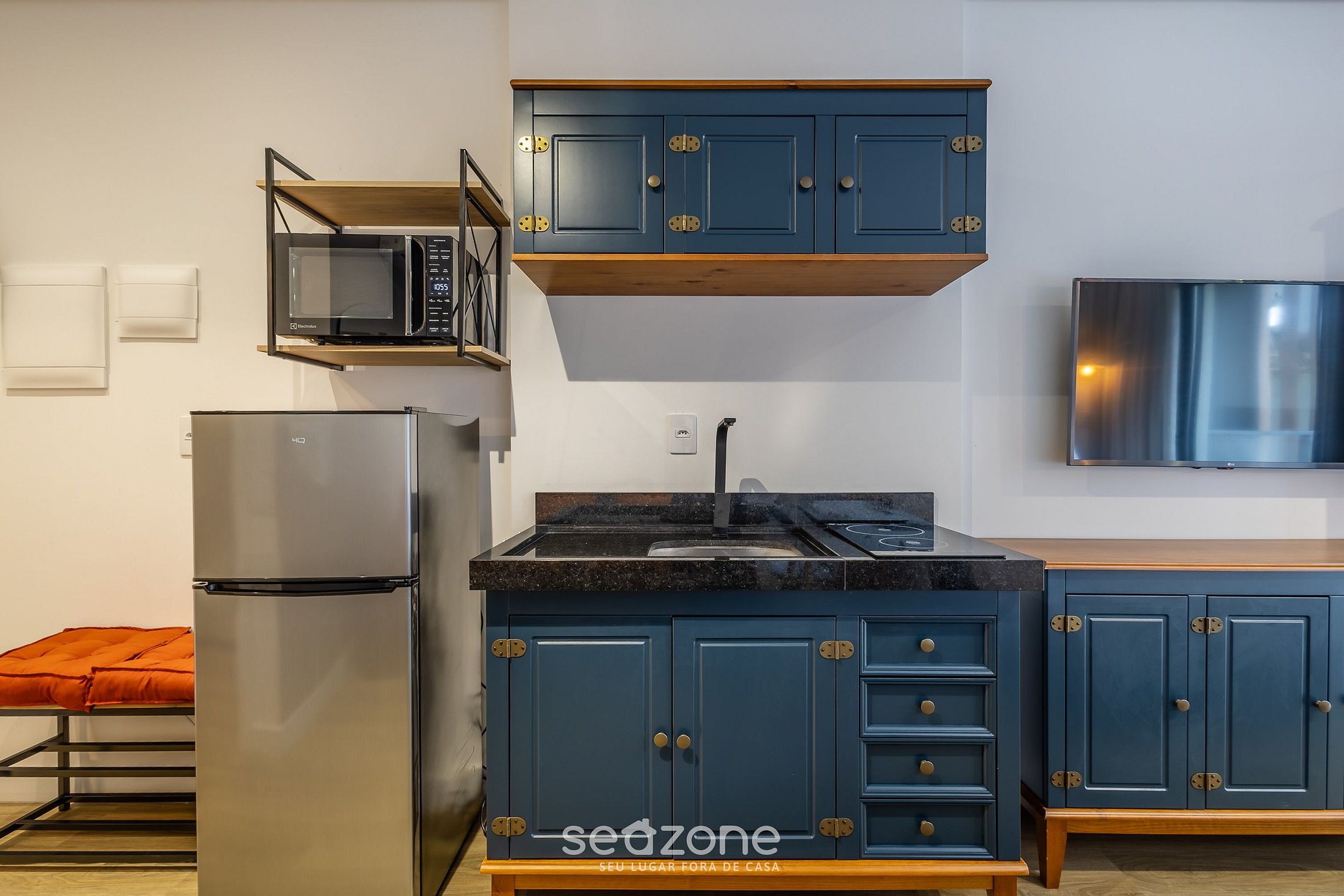- Cozinha completa com frigobar, fogão cooktop (indução), micro-ondas, sanduicheira, chaleira, liquidificador, taças de vinho, panelas, louças e utensílios;