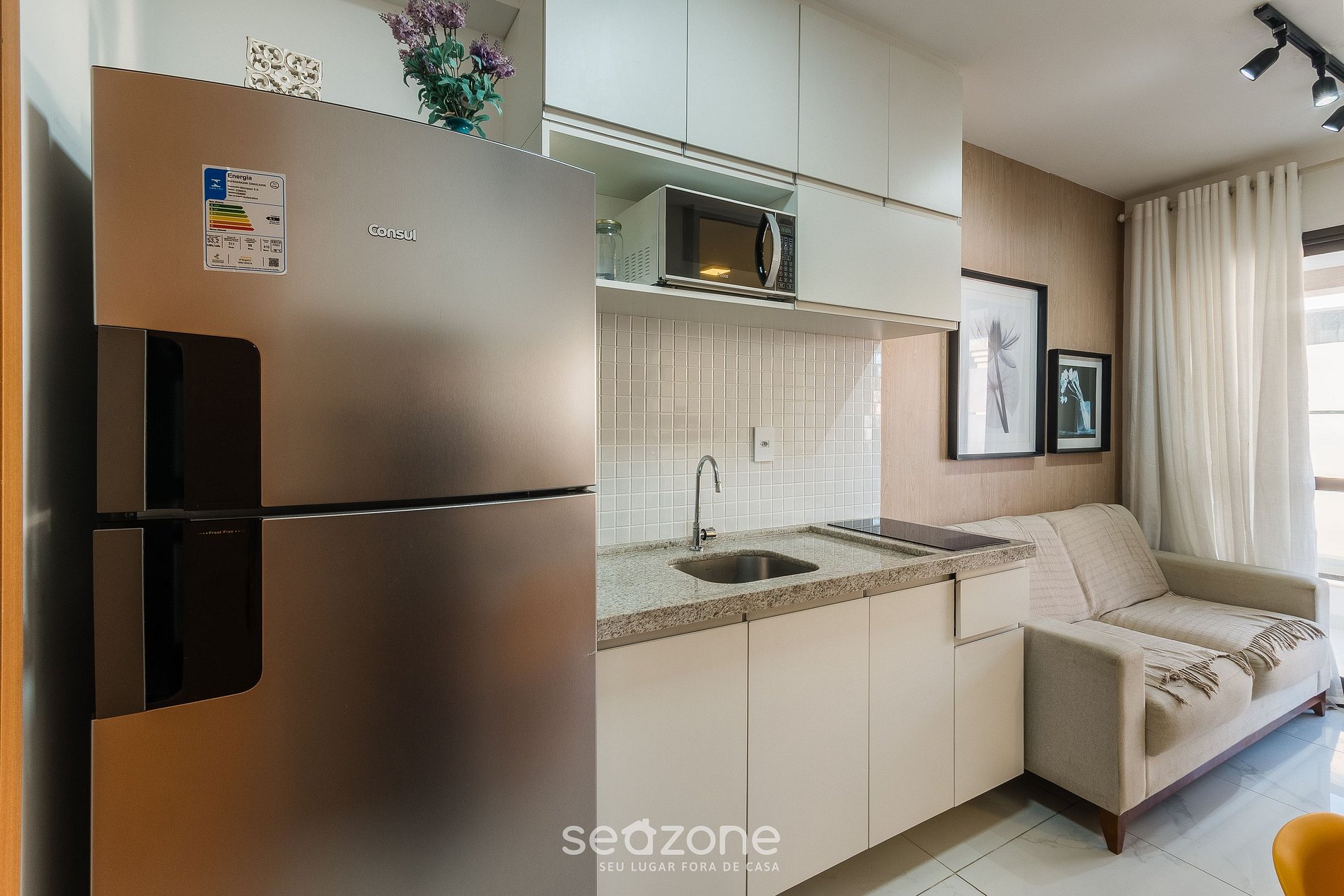 - Cozinha completa com geladeira, fogão cooktop por indução, micro-ondas, sanduicheira, liquidificador, taças de vinho, panelas, louças e utensílios;