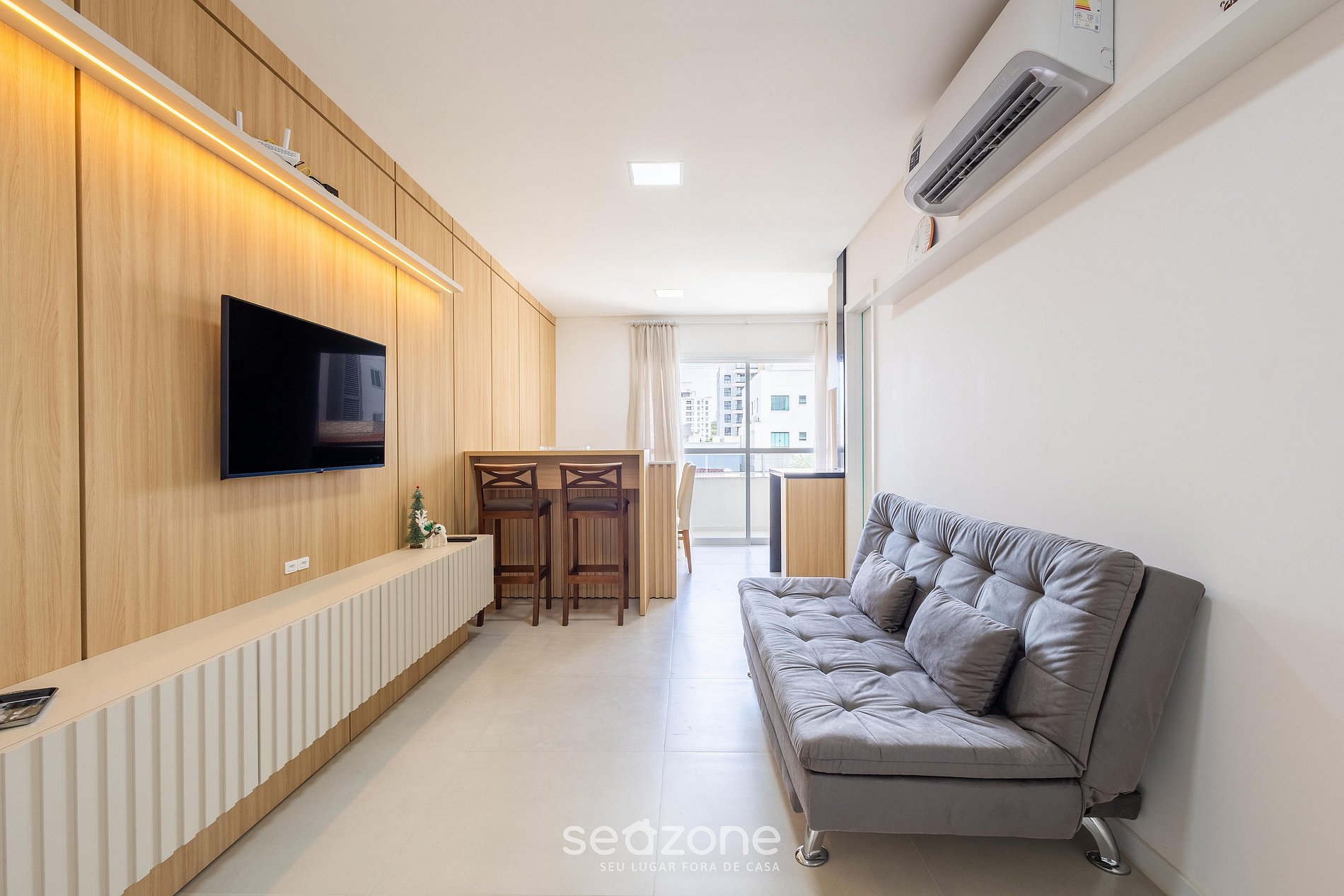 - Sala com com sofá, Smart TV e ar-condicionado;