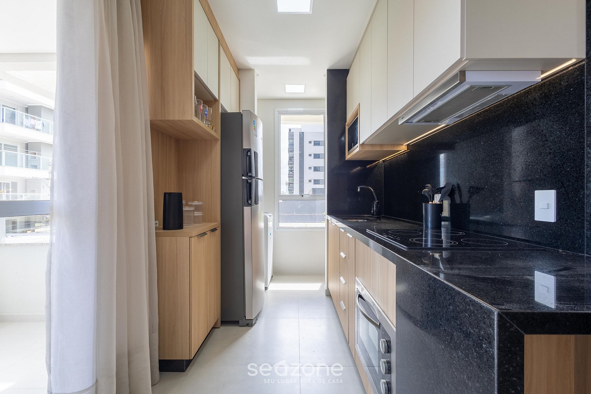 - Cozinha completa com geladeira, fogão cooktop por indução, forno elétrico, microondas, sanduicheira, Kit café (suporte para filtro, garrafa térmica), chaleira elétrica, liquidificador, taças de vinho, panelas, louças e utensílios;