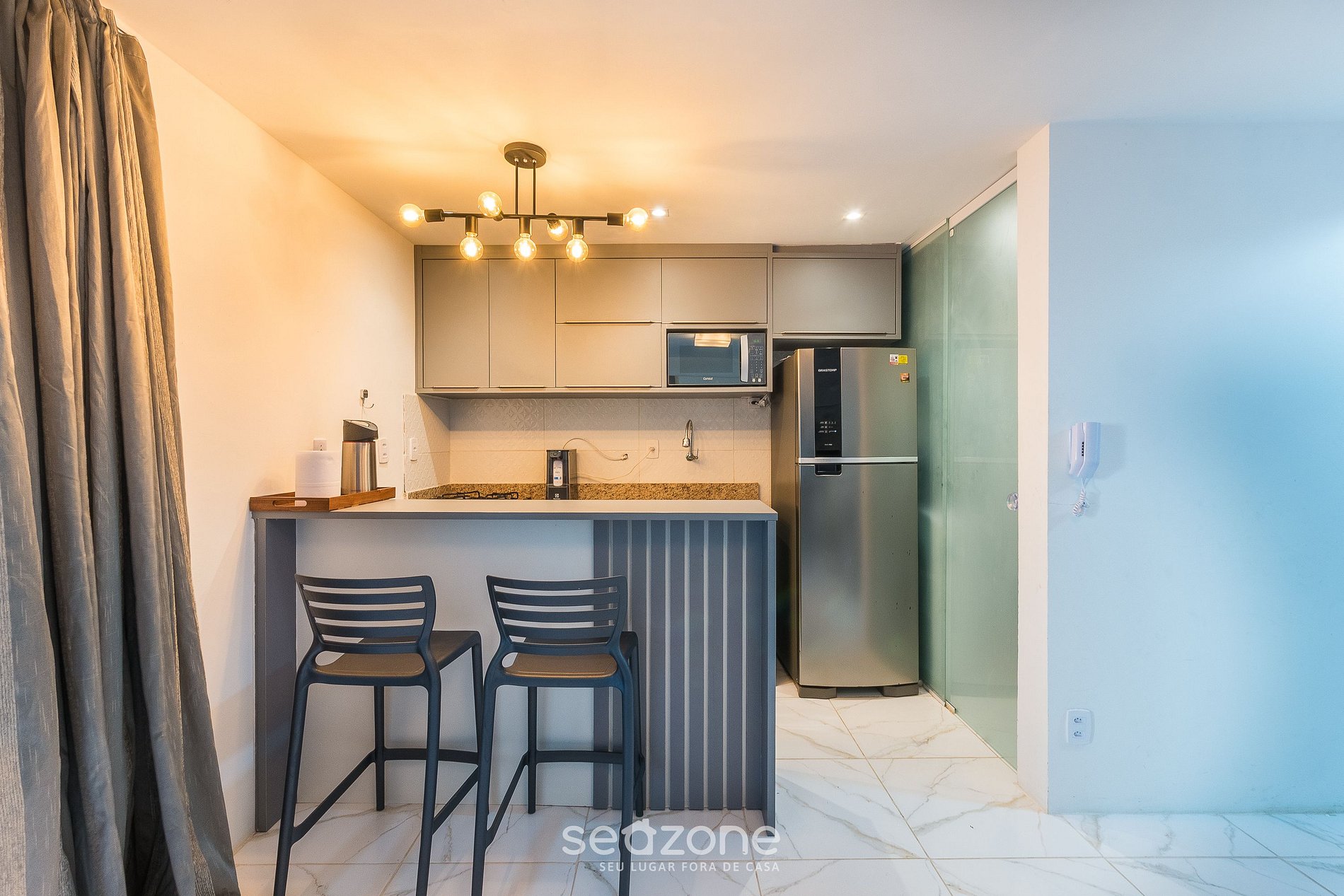 - Cozinha completa com geladeira, fogão cooktop (gás), micro-ondas, sanduicheira, Kit café (suporte para filtro, garrafa térmica), liquidificador, panelas, louças e utensílios;