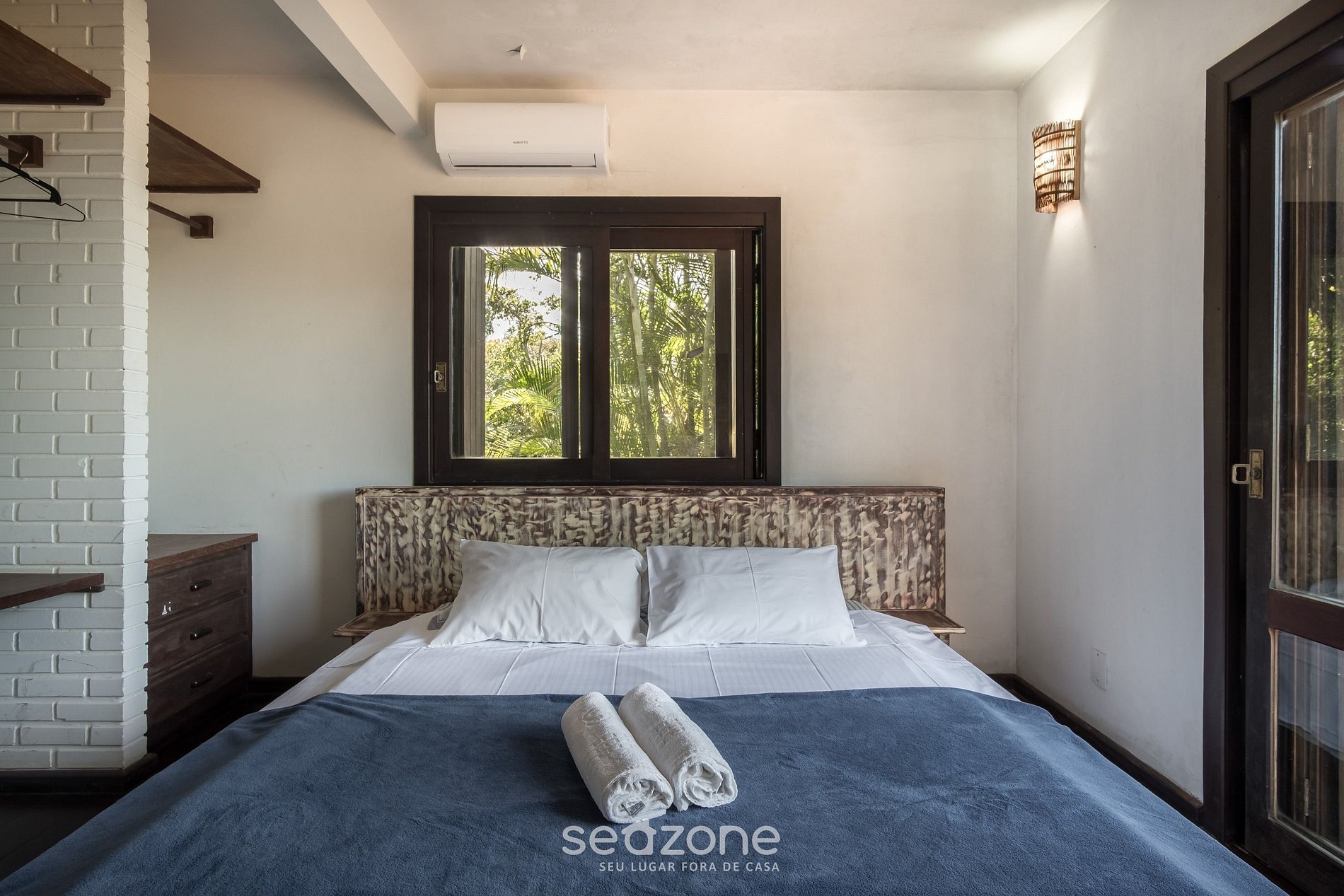 - 1 Quarto com cama de casal king size, ar-condicionado, vista para o mar e armários;