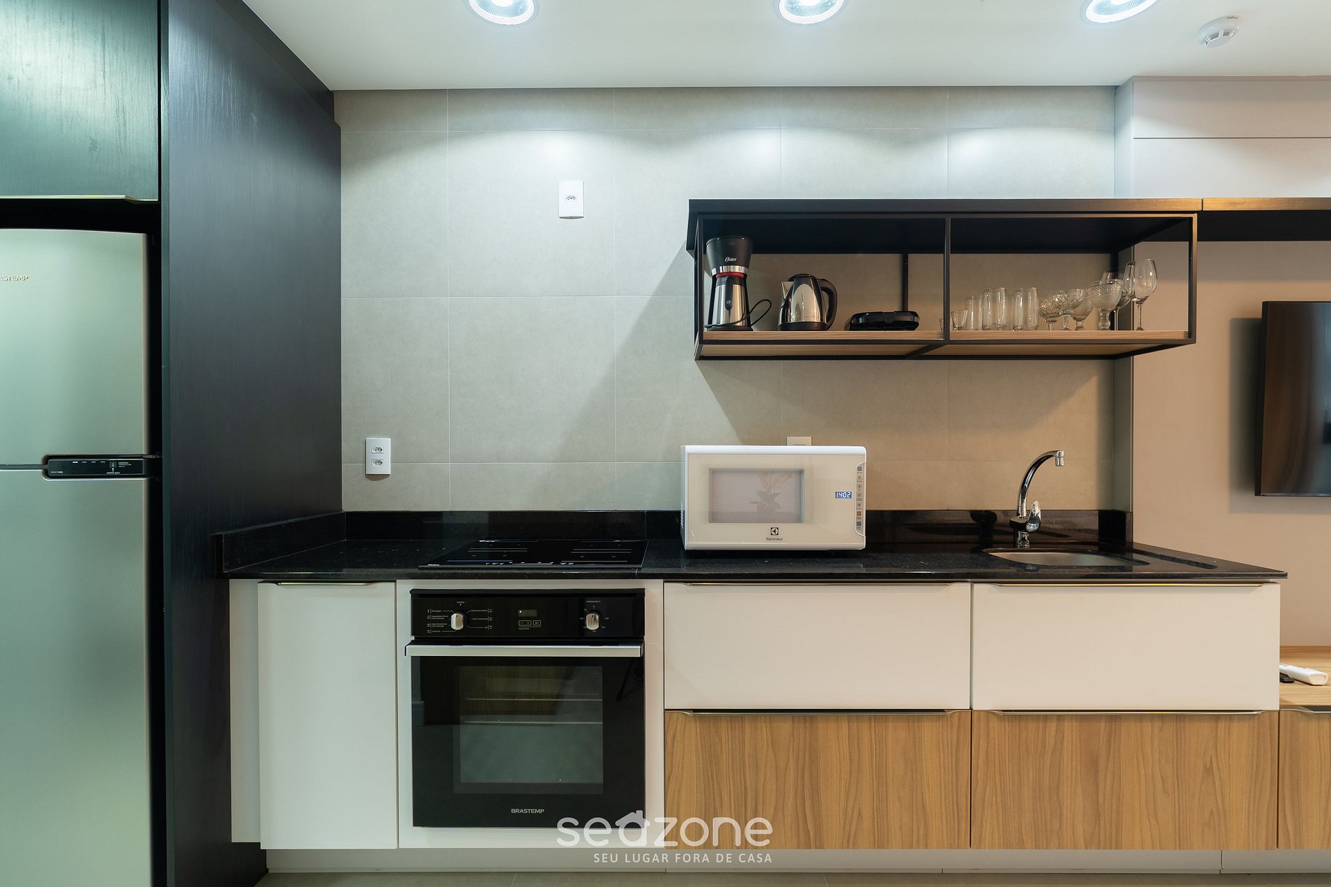 - Cozinha completa com geladeira, fogão cooktop por indução, forno elétrico, microondas, cafeteira elétrica, sanduicheira, chaleira, liquidificador, taças de vinho, panelas, louças e utensílios;