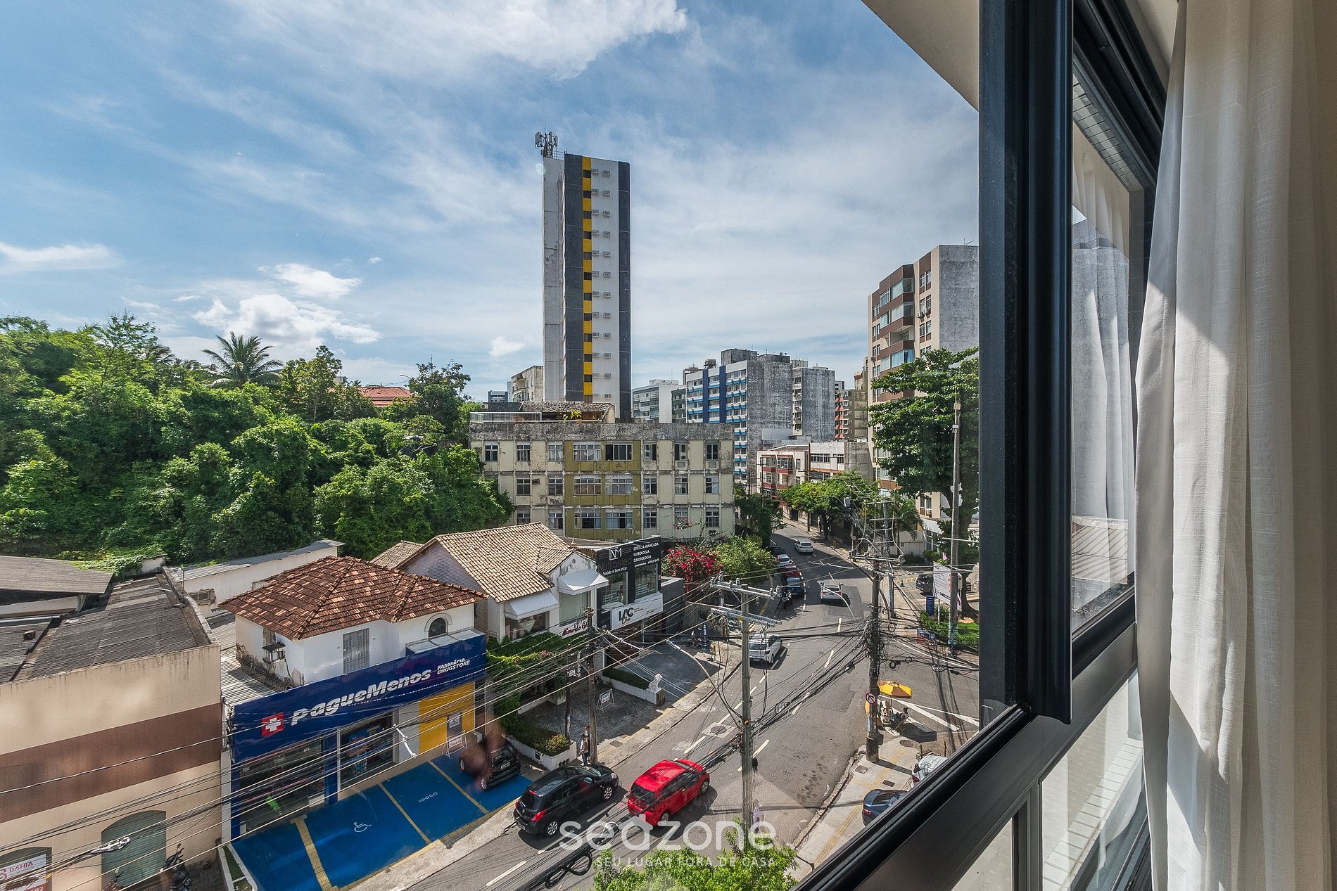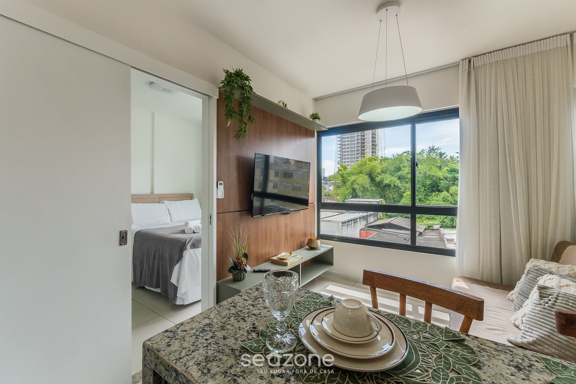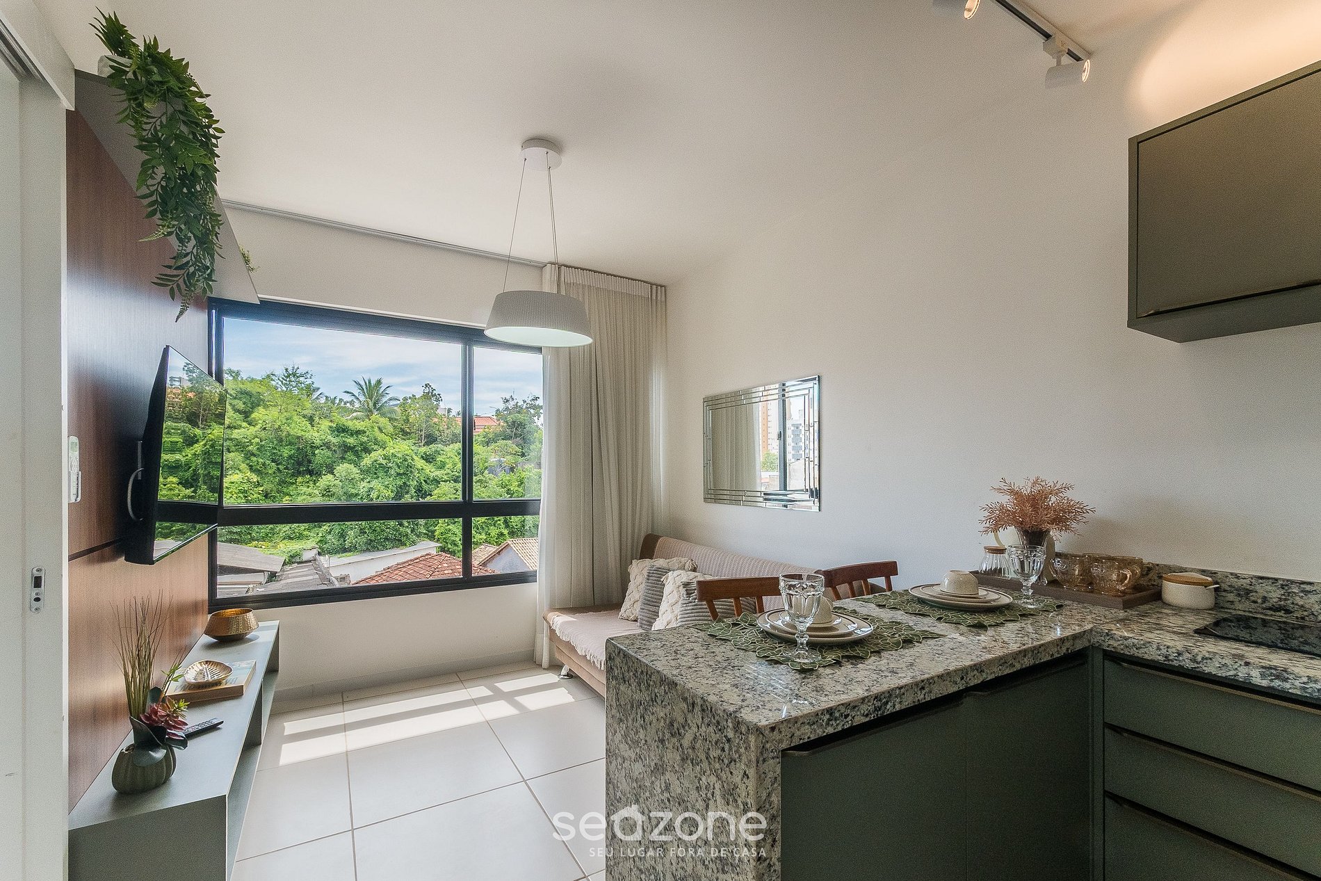 Com suíte climatizada com cama de casal, sala com sofá, Smart TV e ar-condicionado, cozinha completa e vista urbana, você desfruta de ambientes planejados. O prédio conta com piscina no rooftop, coworking e academia. A 400m da praia, perto do Farol, cafés e mercados.