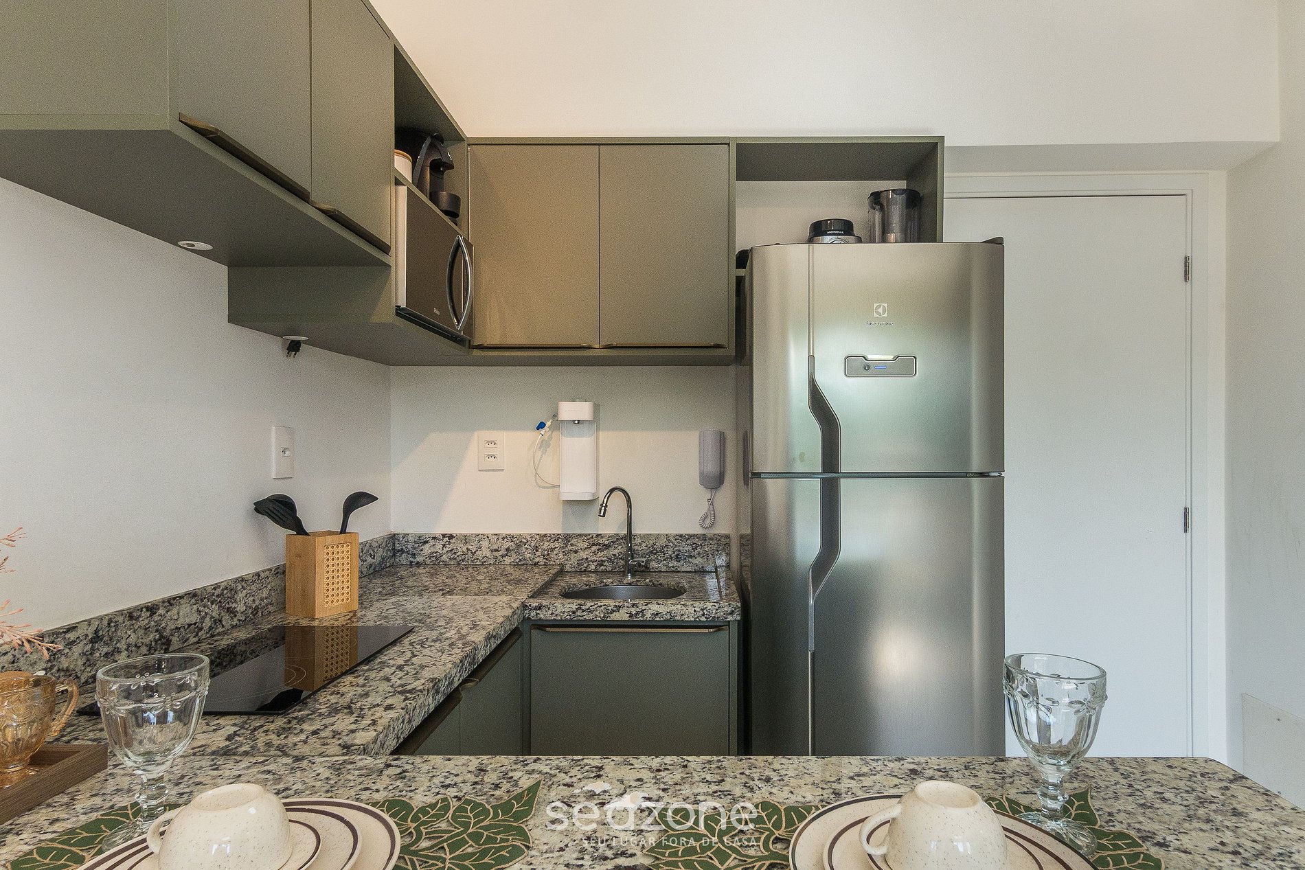 - Cozinha completa com geladeira, fogão cooktop por indução, micro-ondas, sanduicheira, cafeteira elétrica, Kit café (suporte para filtro, garrafa térmica), liquidificador, taças de vinho, panelas, louças e utensílios.
