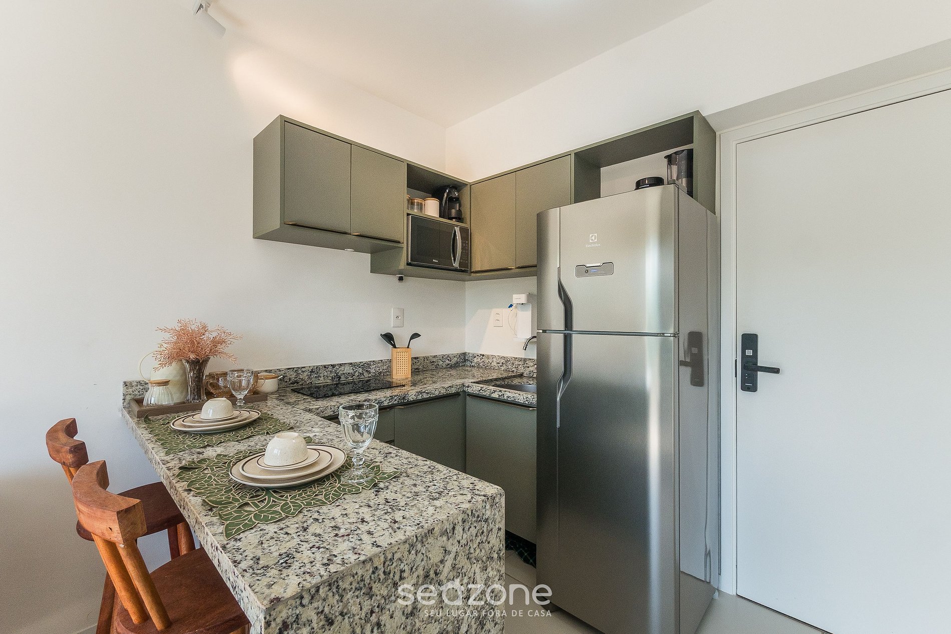 - Espaço para jantar com balcão e 2 banquetas;