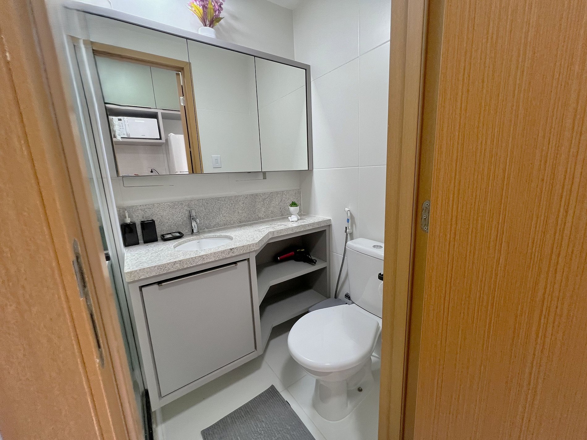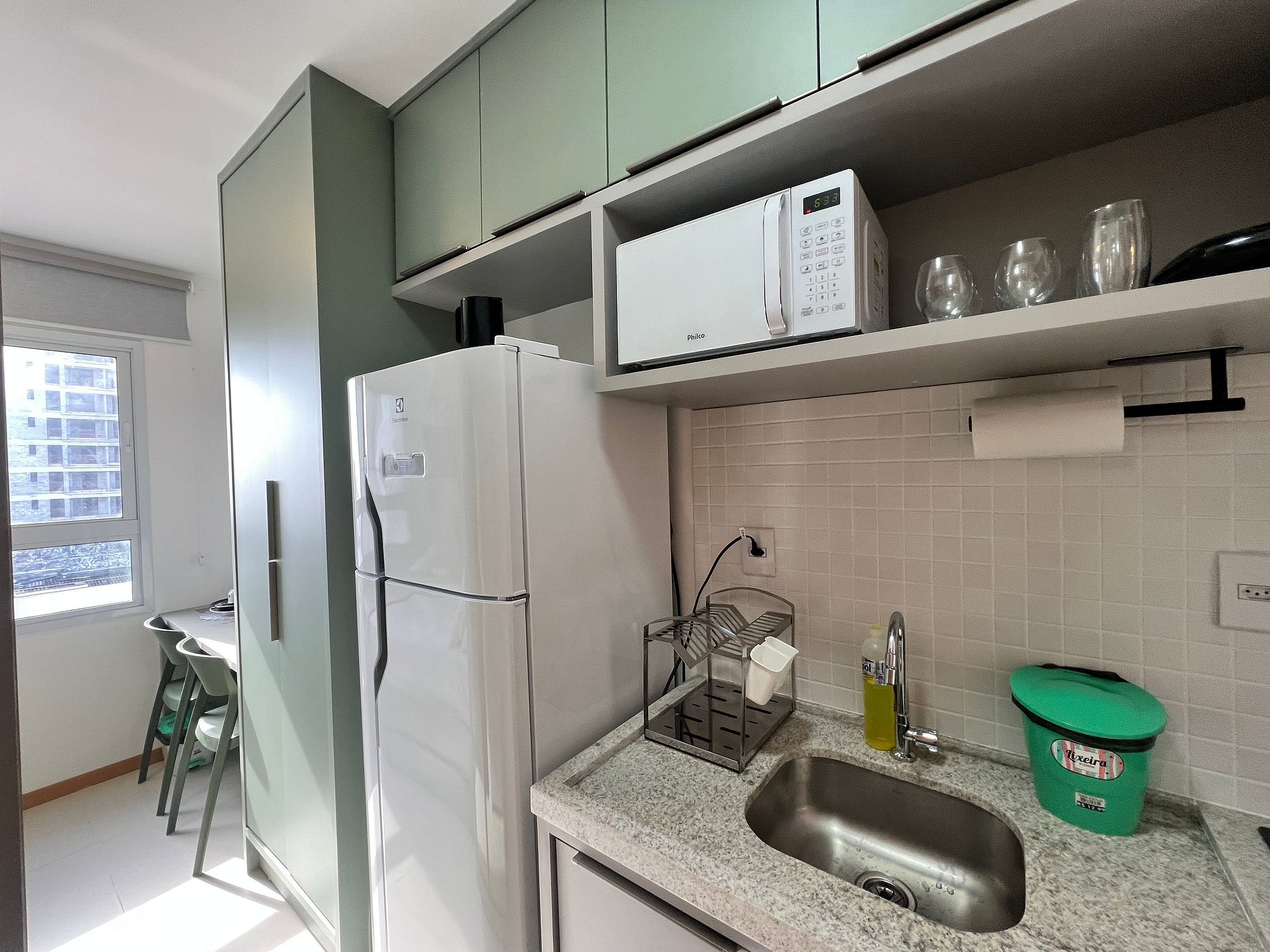 - Espaço para jantar com bancada e cadeiras;