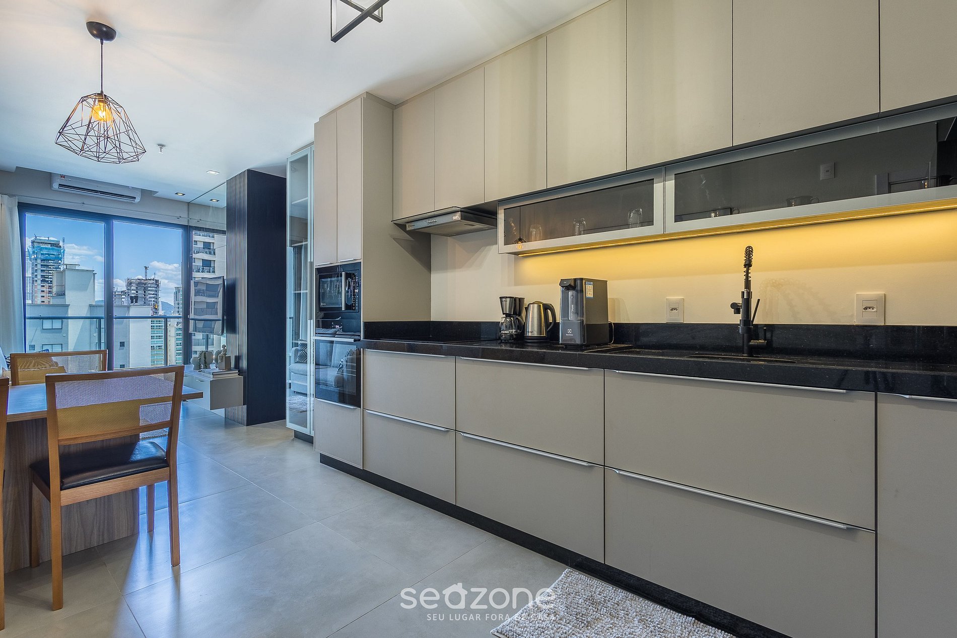 - Cozinha completa com geladeira, fogão cooktop (indução), forno elétrico, micro-ondas, sanduicheira, cafeteira elétrica, chaleira, liquidificador, taças de vinho, panelas, louças e utensílios;