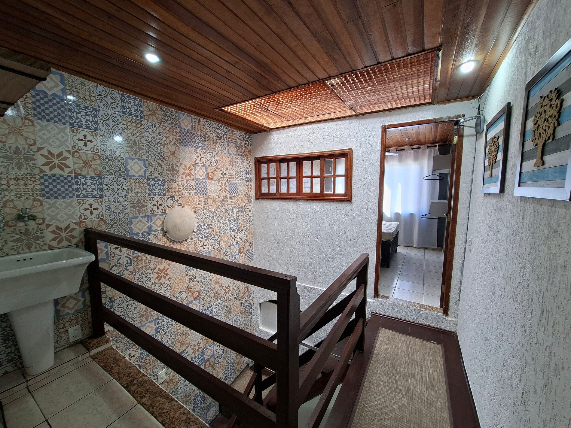 - 1 Quarto localizada no mezzanino com cama de casal, cama de solteiro, arara para roupas, e ventilador de teto;