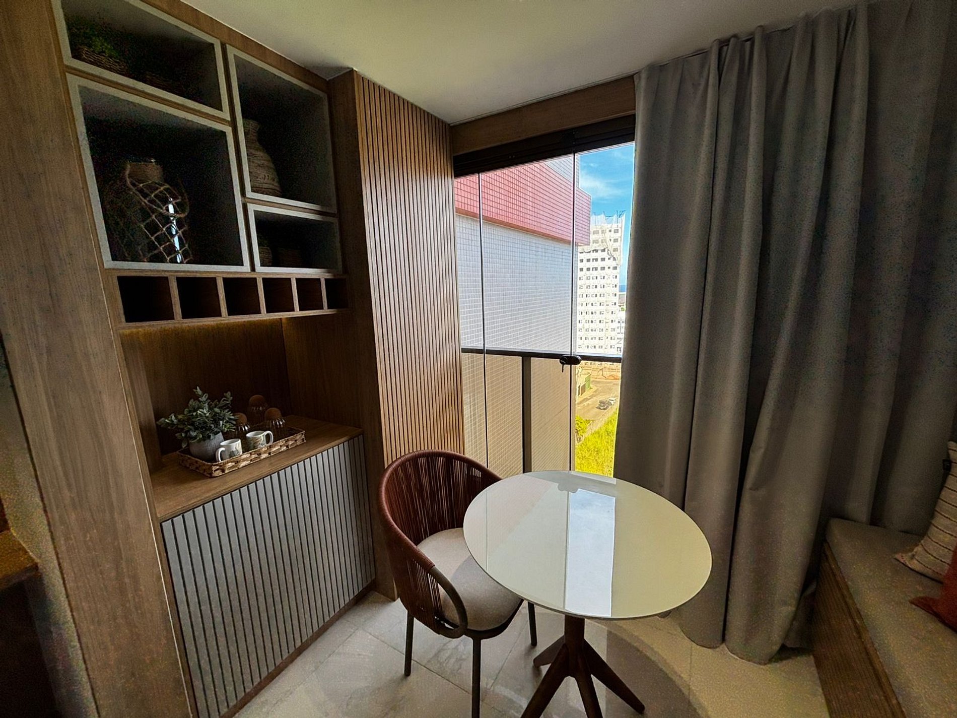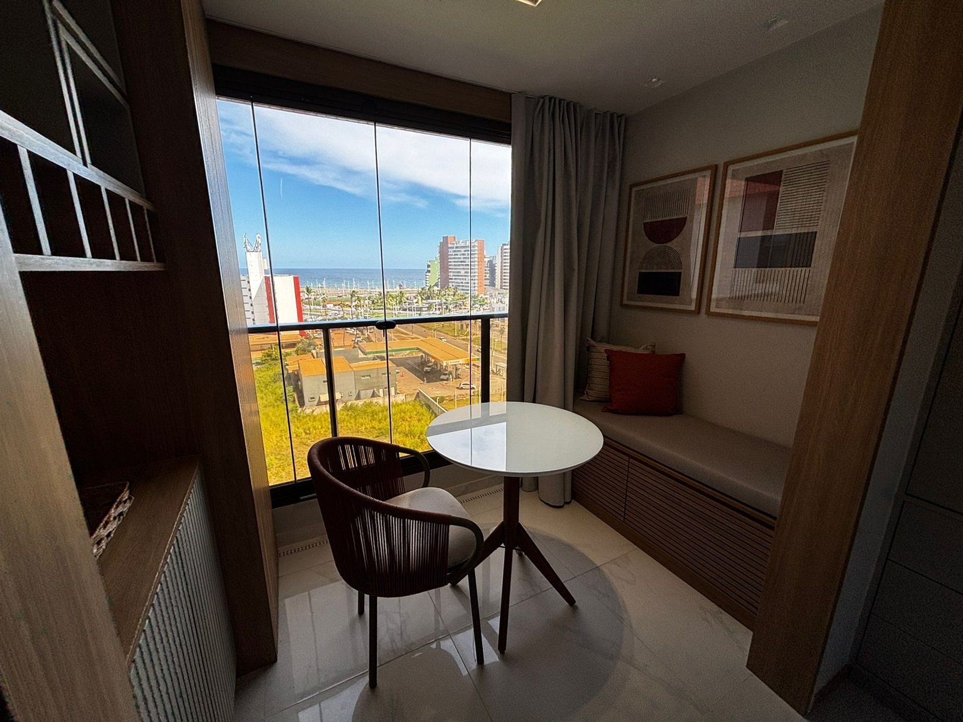 - Sacada integrada com o estúdio com mesa, cadeira, sofá e vista para a cidade e mar;