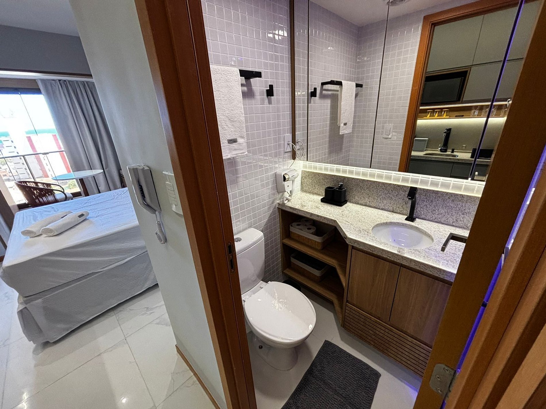 - Cama de casal, smart TV, armário e ar-condicionado;