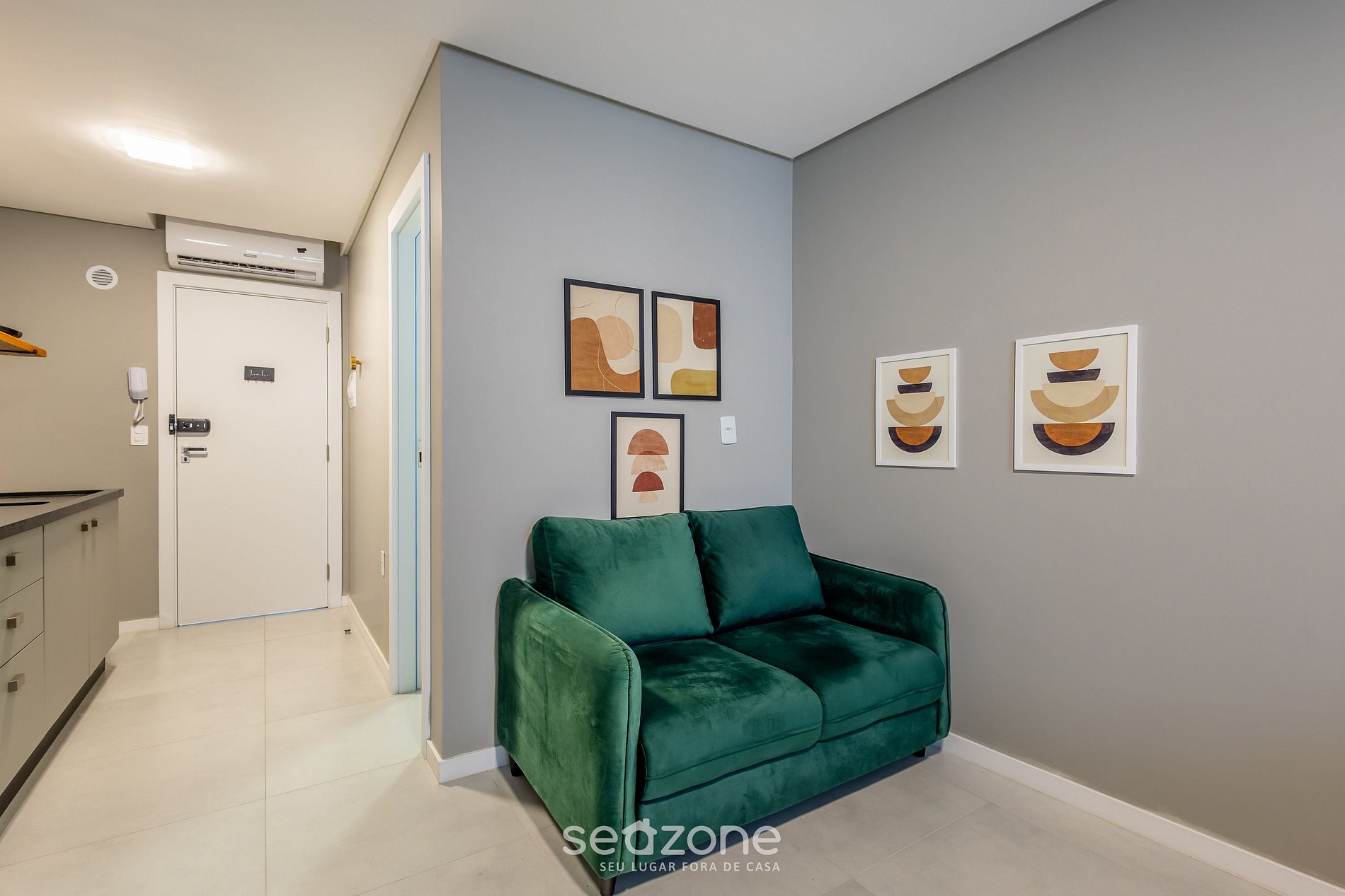 - Espaço com sofá e Smart TV, integrada ao Stúdio.