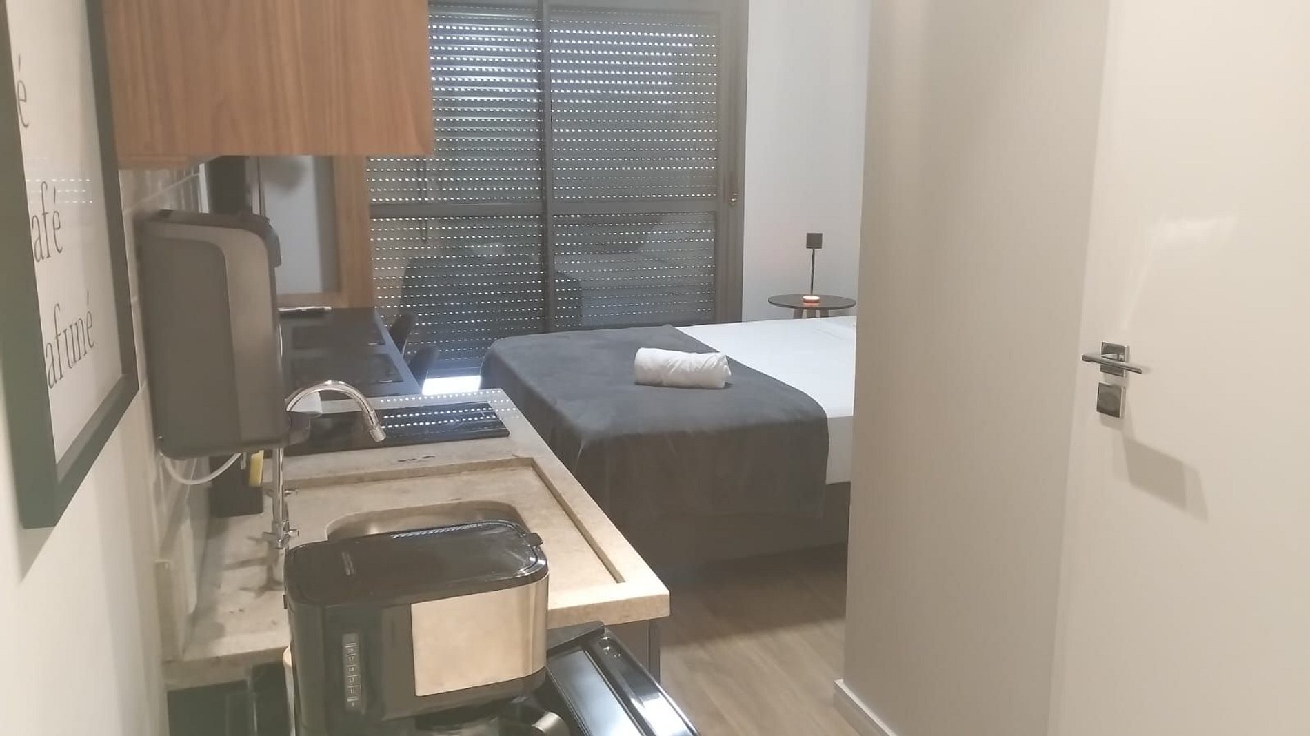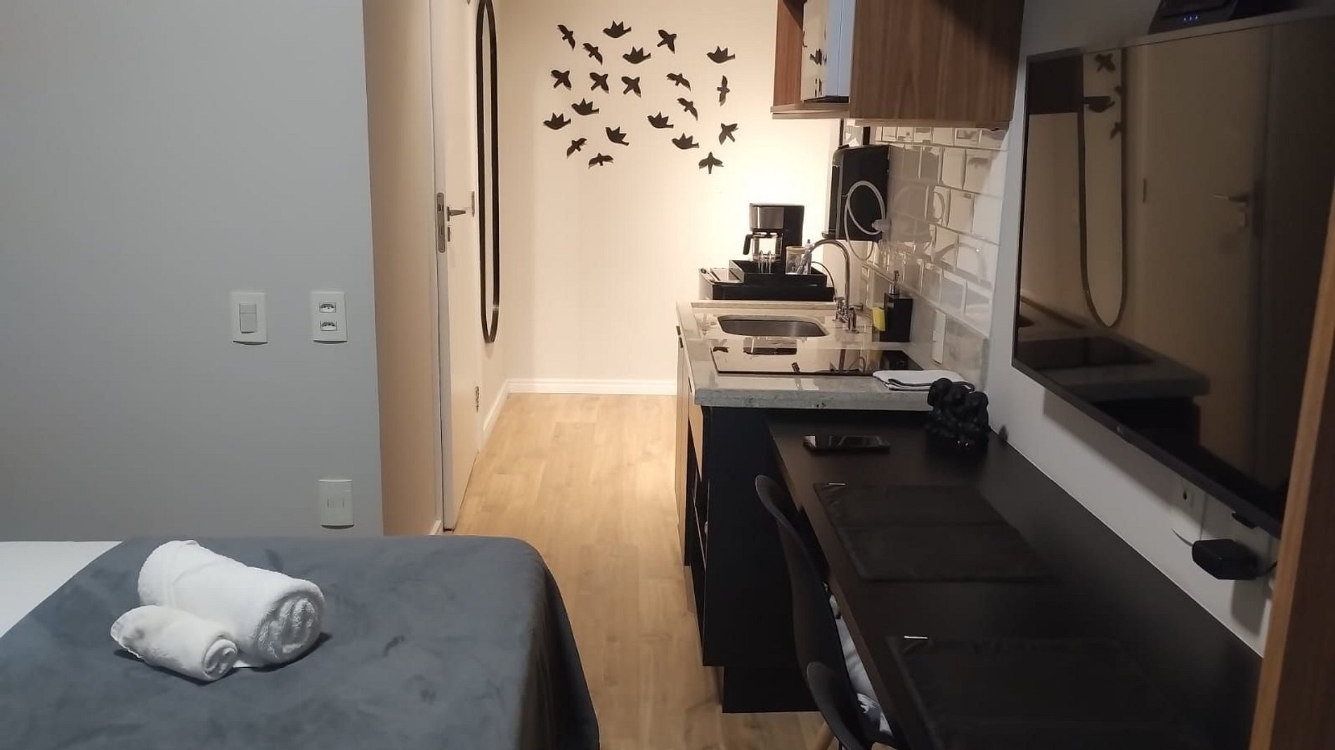 - Cozinha completa com frigobar, fogão cooktop (indução), micro-ondas, sanduicheira, cafeteira elétrica, chaleira elétrica, liquidificador, taças de vinho, panelas, louças e utensílios;