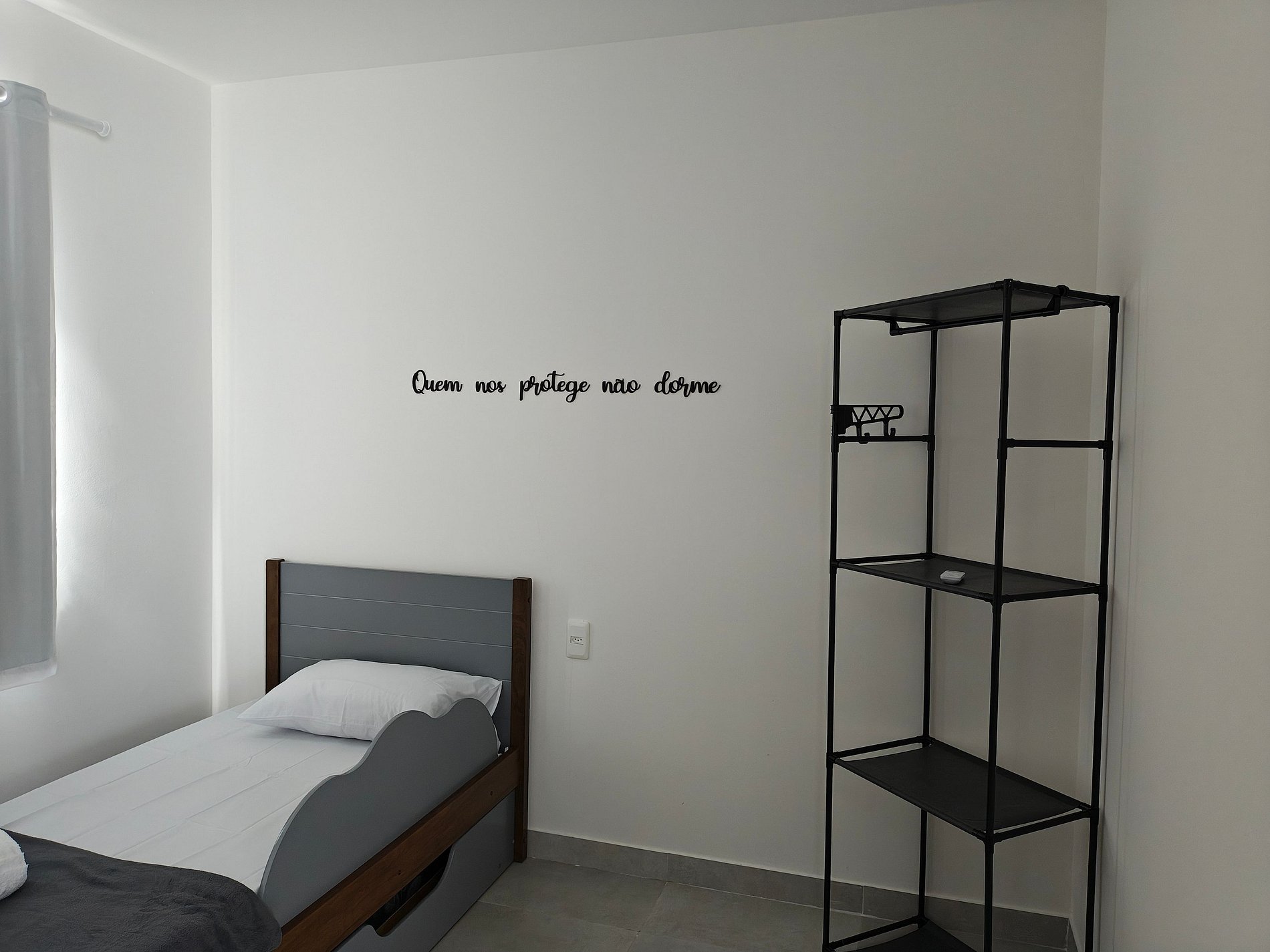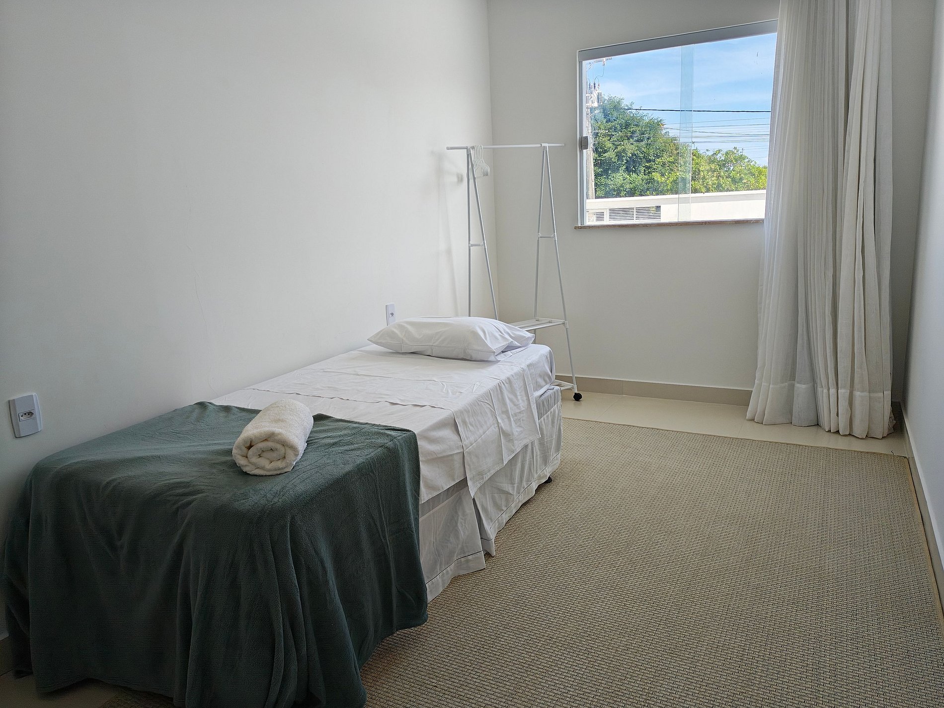 - 1 Quarto com cama de solteiro, arara para roupas e ventilador portátil;