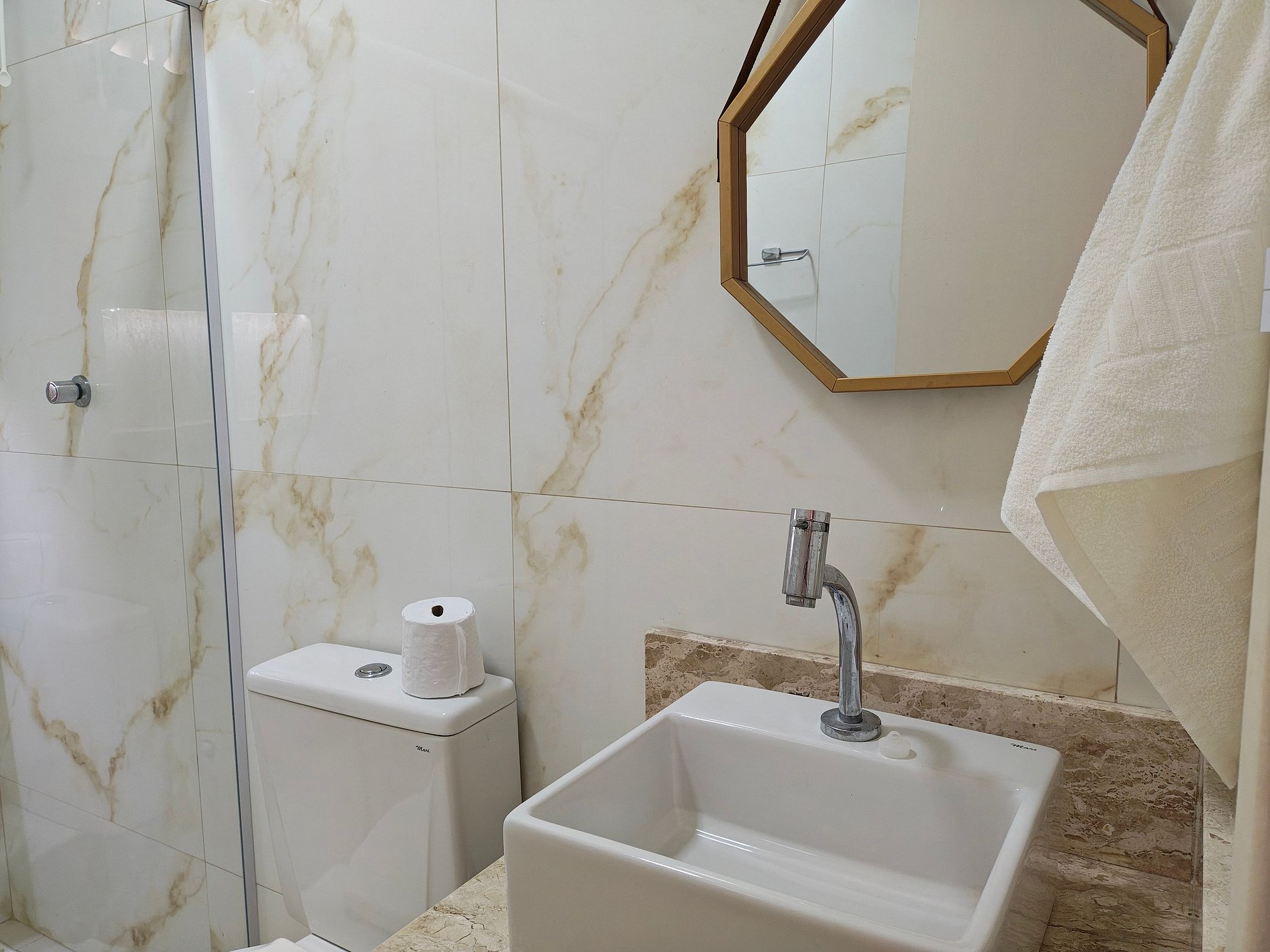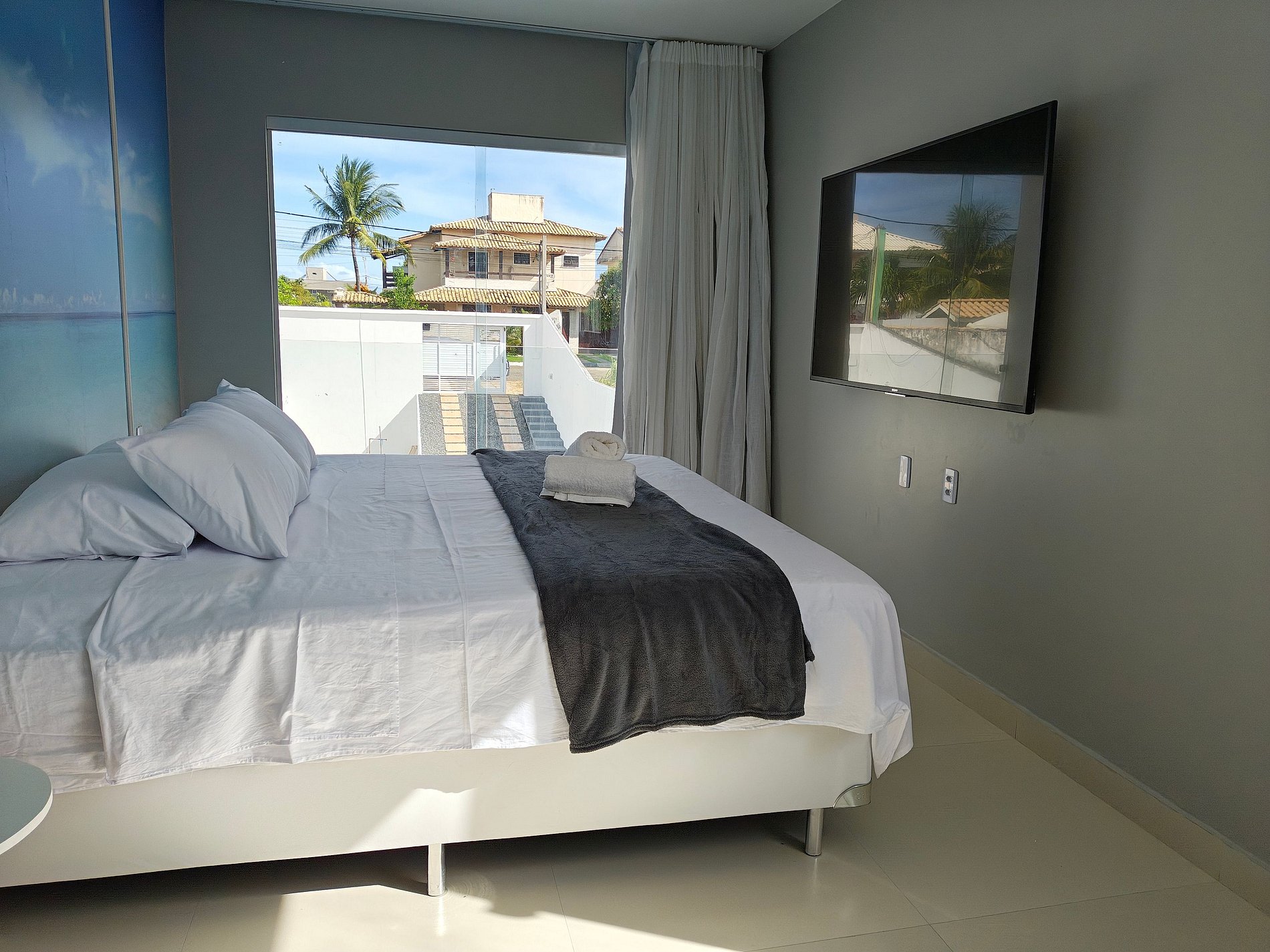 - 1 Suíte com cama king, armário e ar-condicionado;