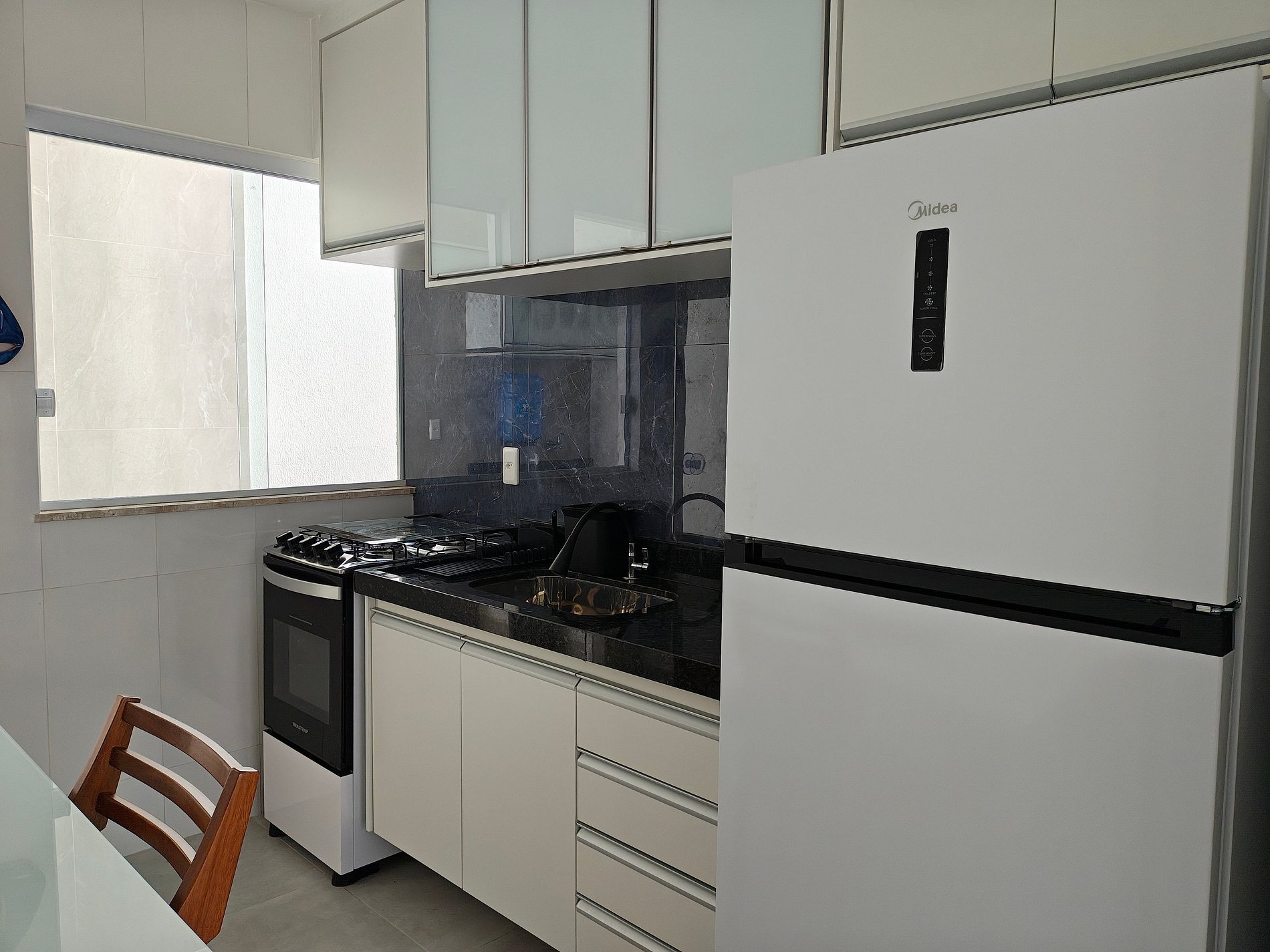 - Cozinha completa com geladeira, fogão cooktop (gás), micro-ondas, sanduicheira, cafeteira elétrica, leiteira, liquidificador, taças de vinho, panelas, louças e utensílios;
