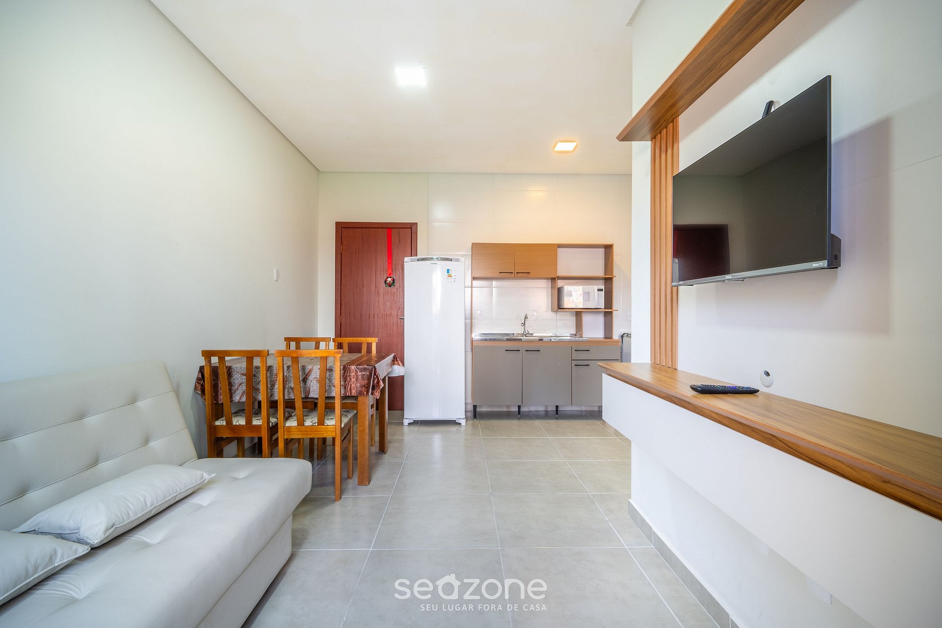 - Sala de estar com sofá-cama, TV Smart, ventilador portátil e mesa com 4 cadeiras;