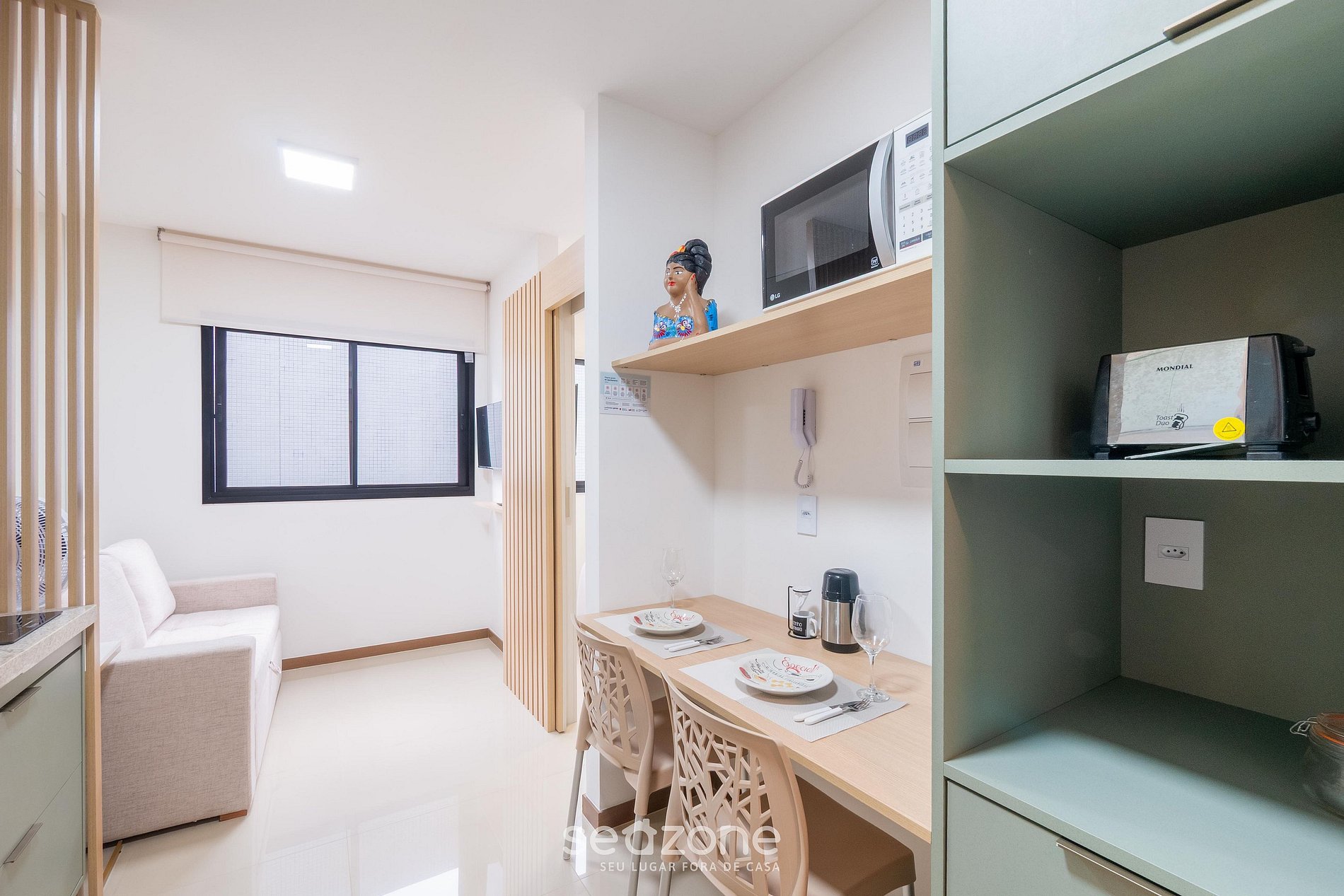 - Espaço para jantar com bancada e 2 cadeiras;