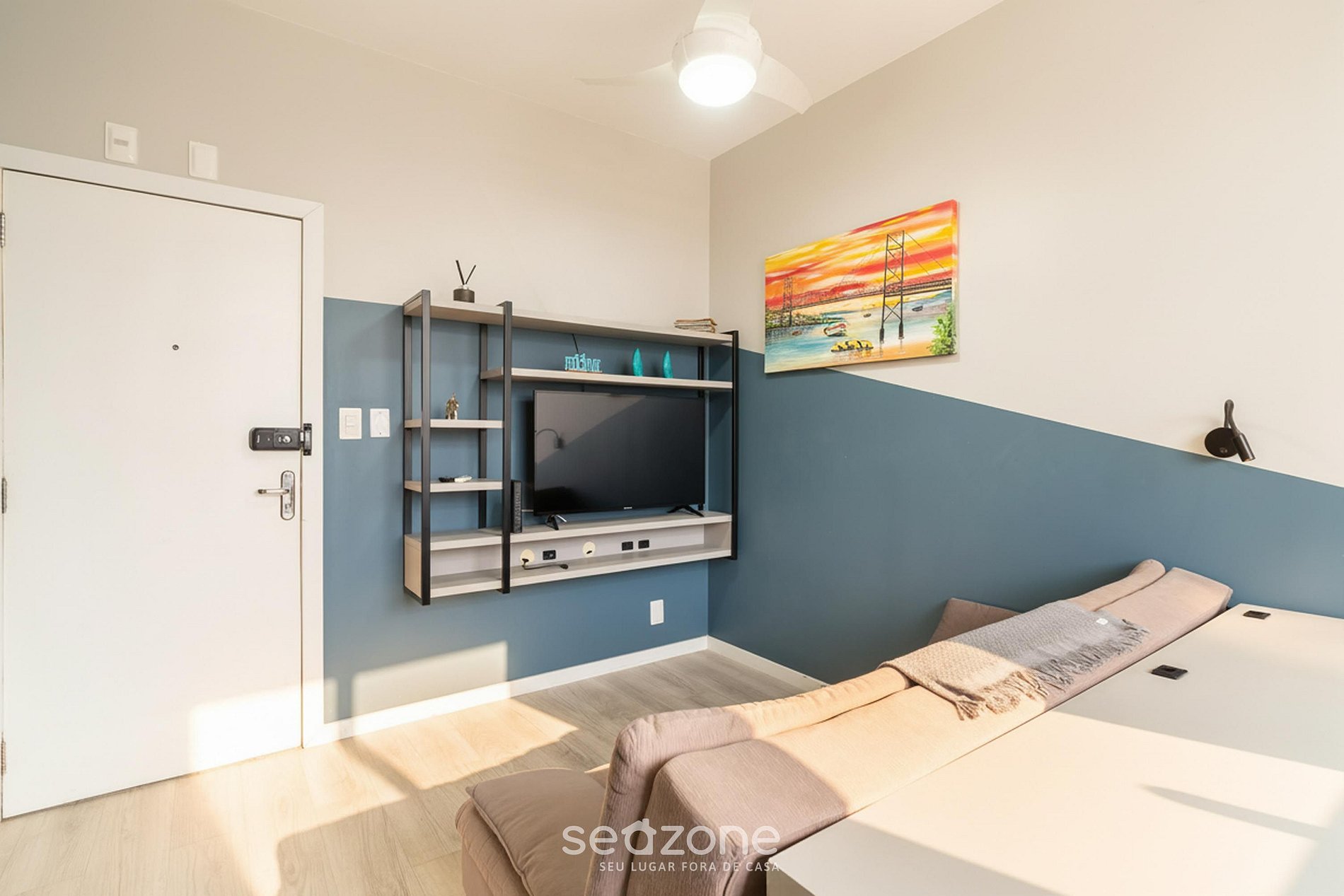 - Sala de estar com Sofá, ventilador de teto e Smart TV;