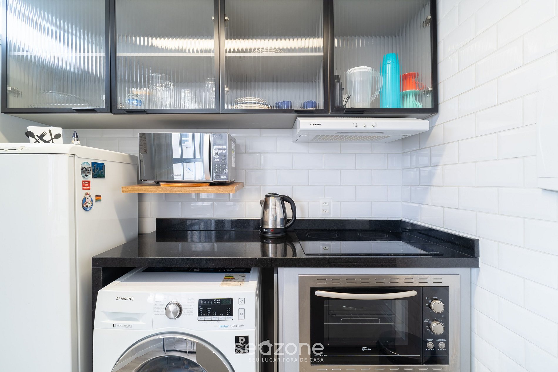 - Cozinha completa com geladeira, fogão cooktop (indução), forno elétrico, micro-ondas, liquidificador, sanduicheira, cafeteira elétrica, chaleira elétrica, taças de vinho, panelas, louças e utensílios;