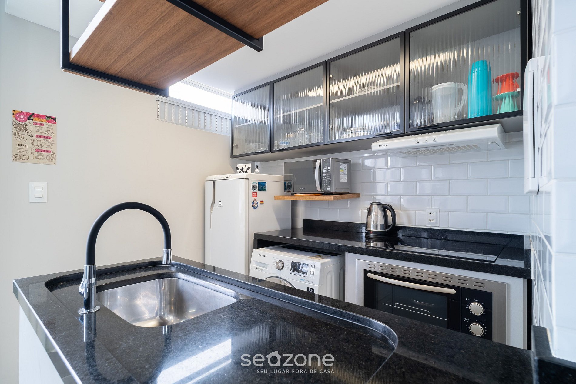 - Cozinha completa com geladeira, fogão cooktop (indução), forno elétrico, micro-ondas, liquidificador, sanduicheira, cafeteira elétrica, chaleira elétrica, taças de vinho, panelas, louças e utensílios;