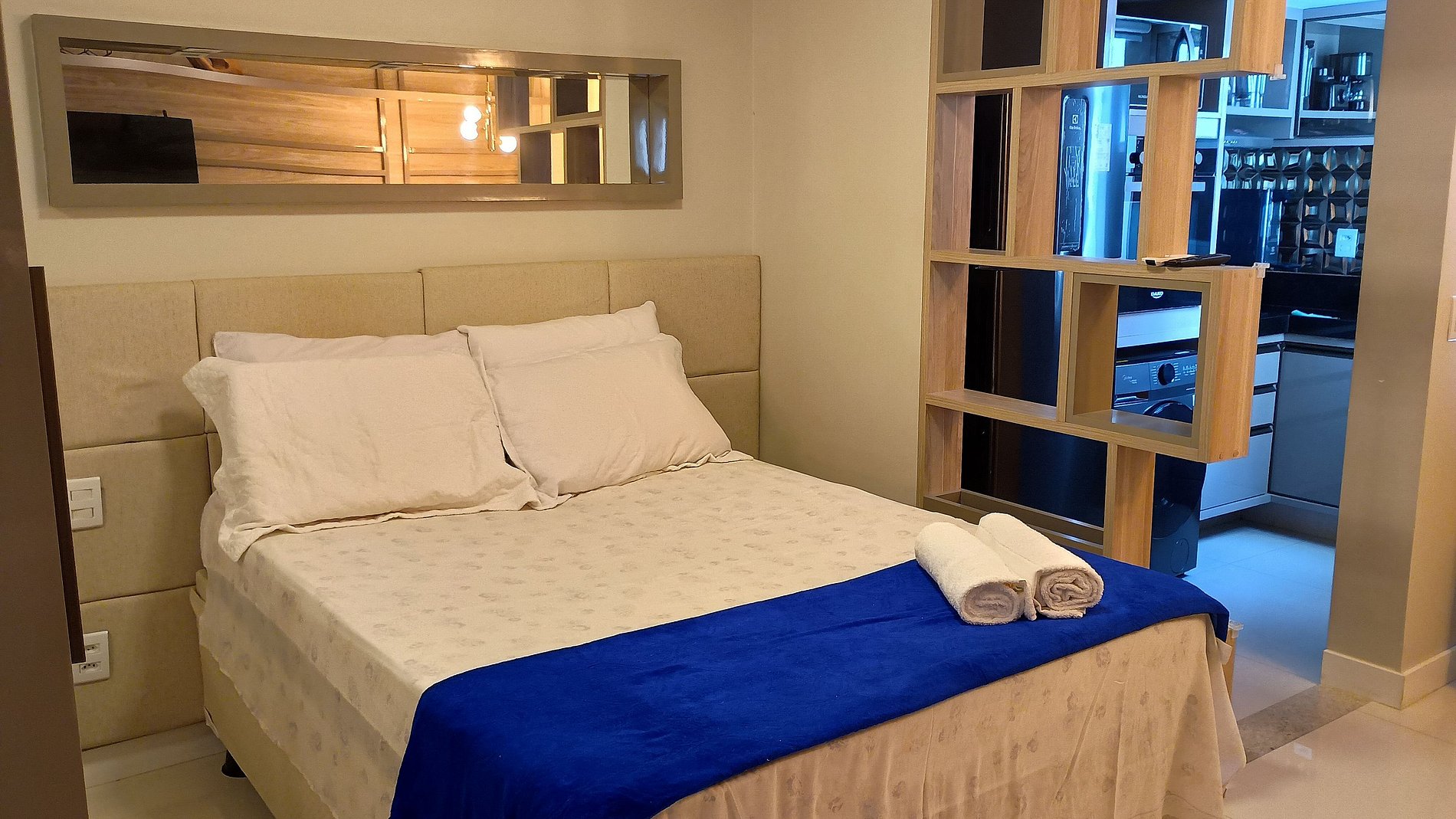 - Cama de casal, armário e ar-condicionado;