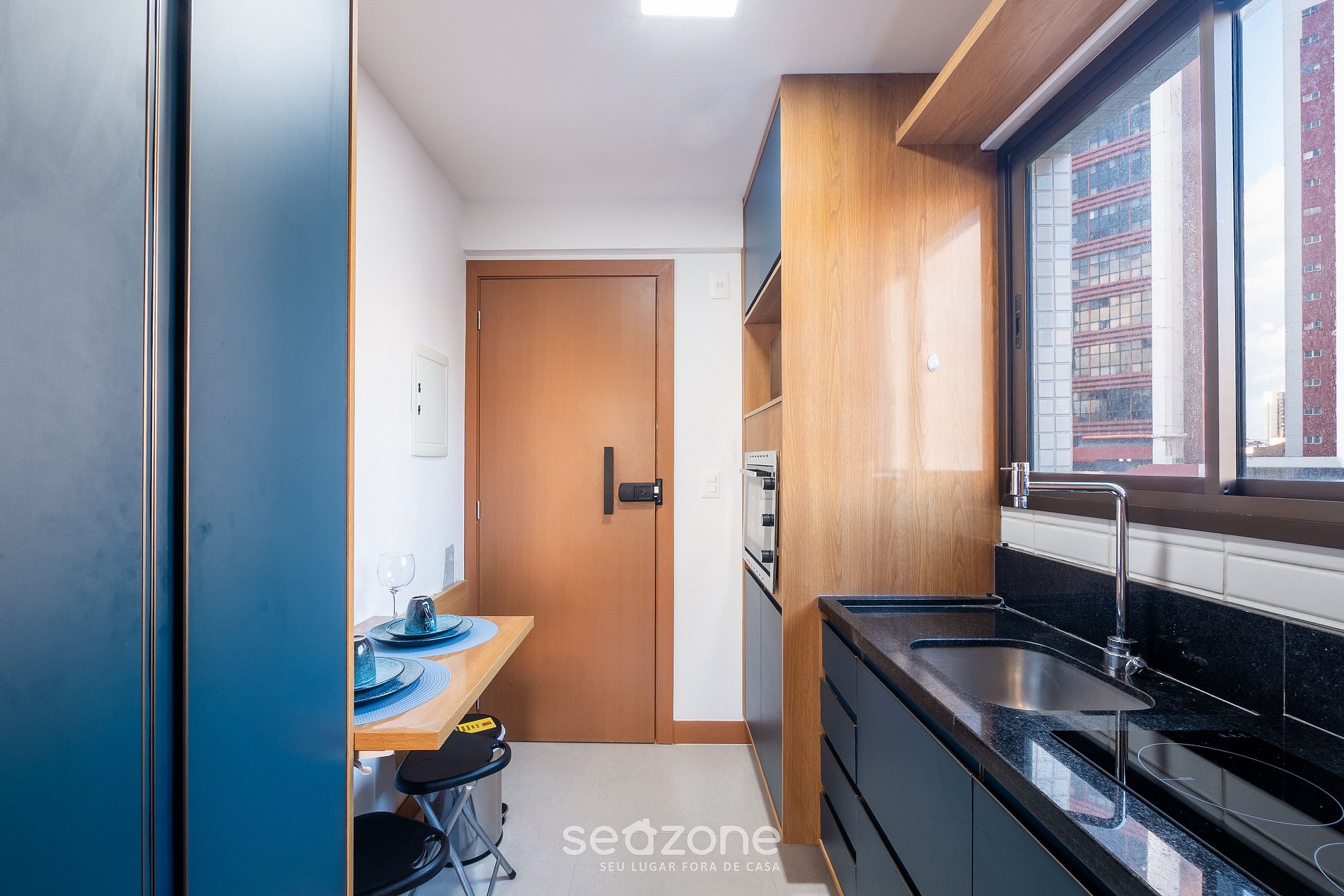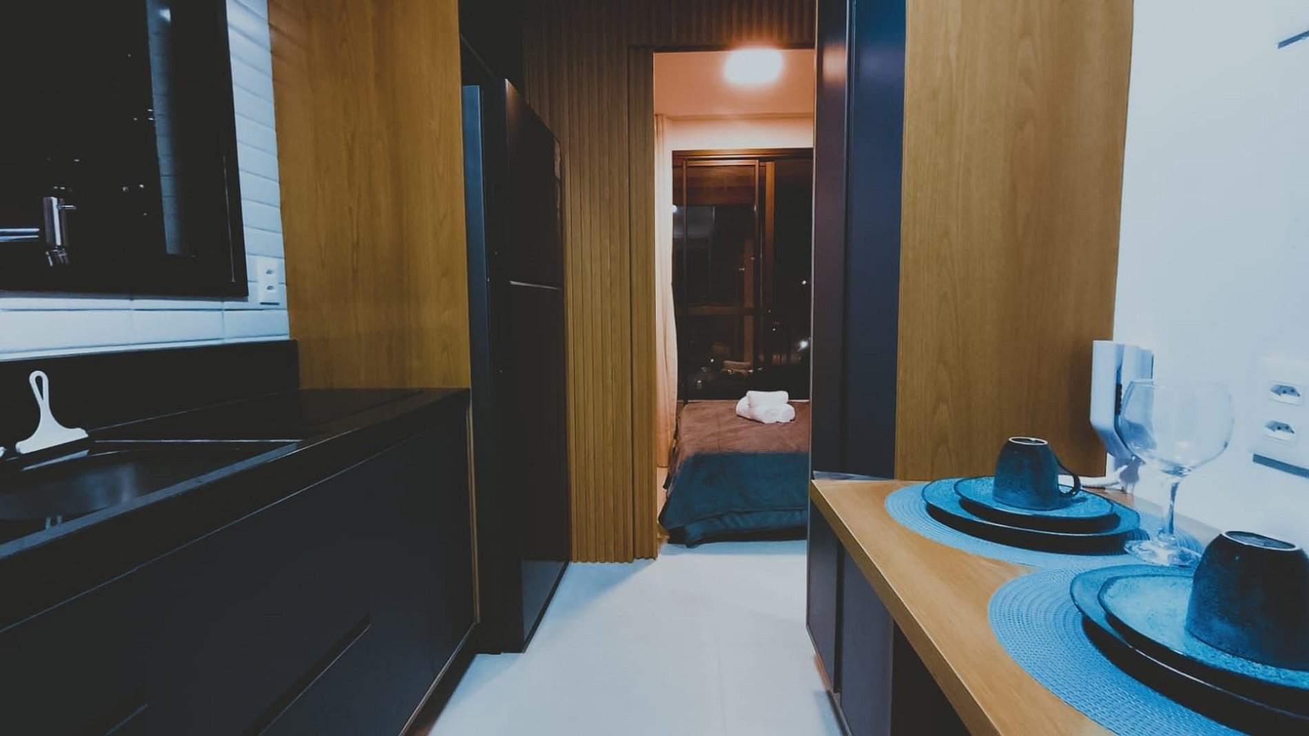 - Cozinha completa com geladeira, fogão cooktop por indução, microondas, liquidificador, taças de vinho, panelas, louças e utensílios;