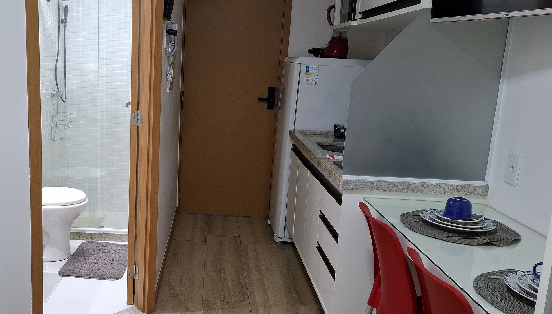 - Espaço para jantar com bancada e 2 cadeiras;