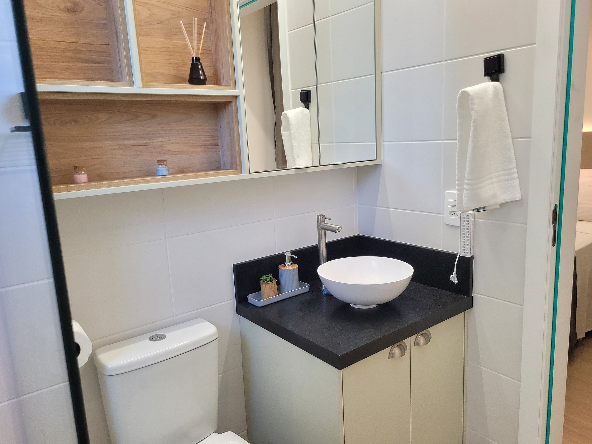 - 1 suíte com cama de casal, armário, espaço para trabalho e ar-condicionado;