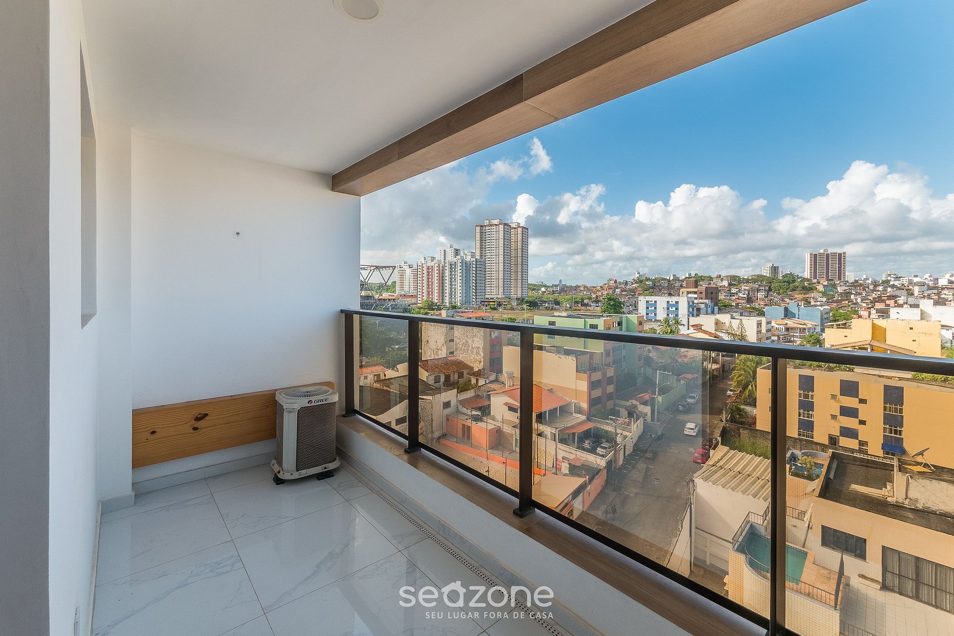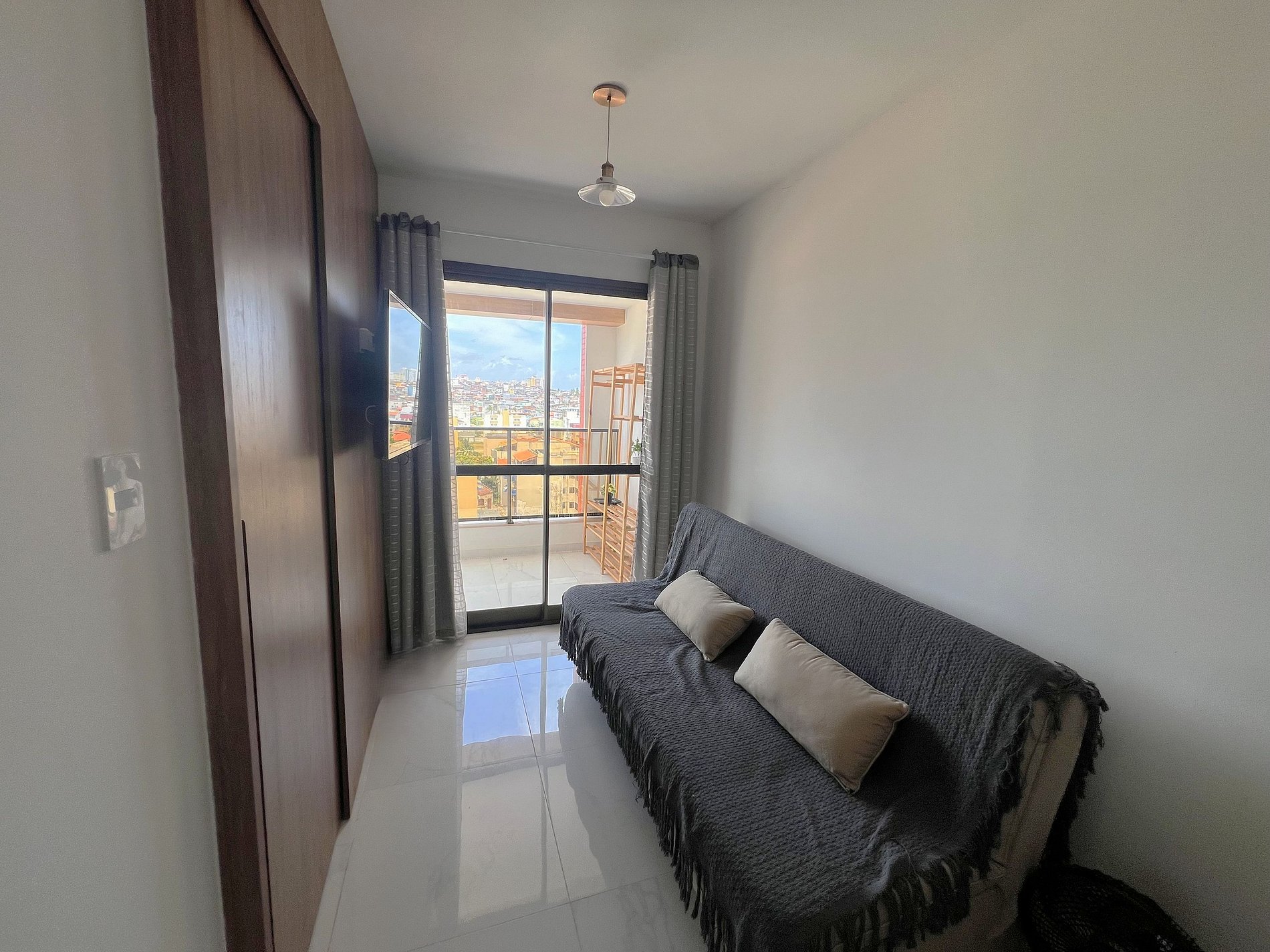Suíte climatizada com cama de casal, sala com sofá-cama, Smart TV, cozinha equipada e varanda ampla com vista urbana. A 750m da orla e próximo ao Parque Costa Azul, restaurantes, mercados e principais vias da cidade. Condomínio com piscina no rooftop, academia e coworking.