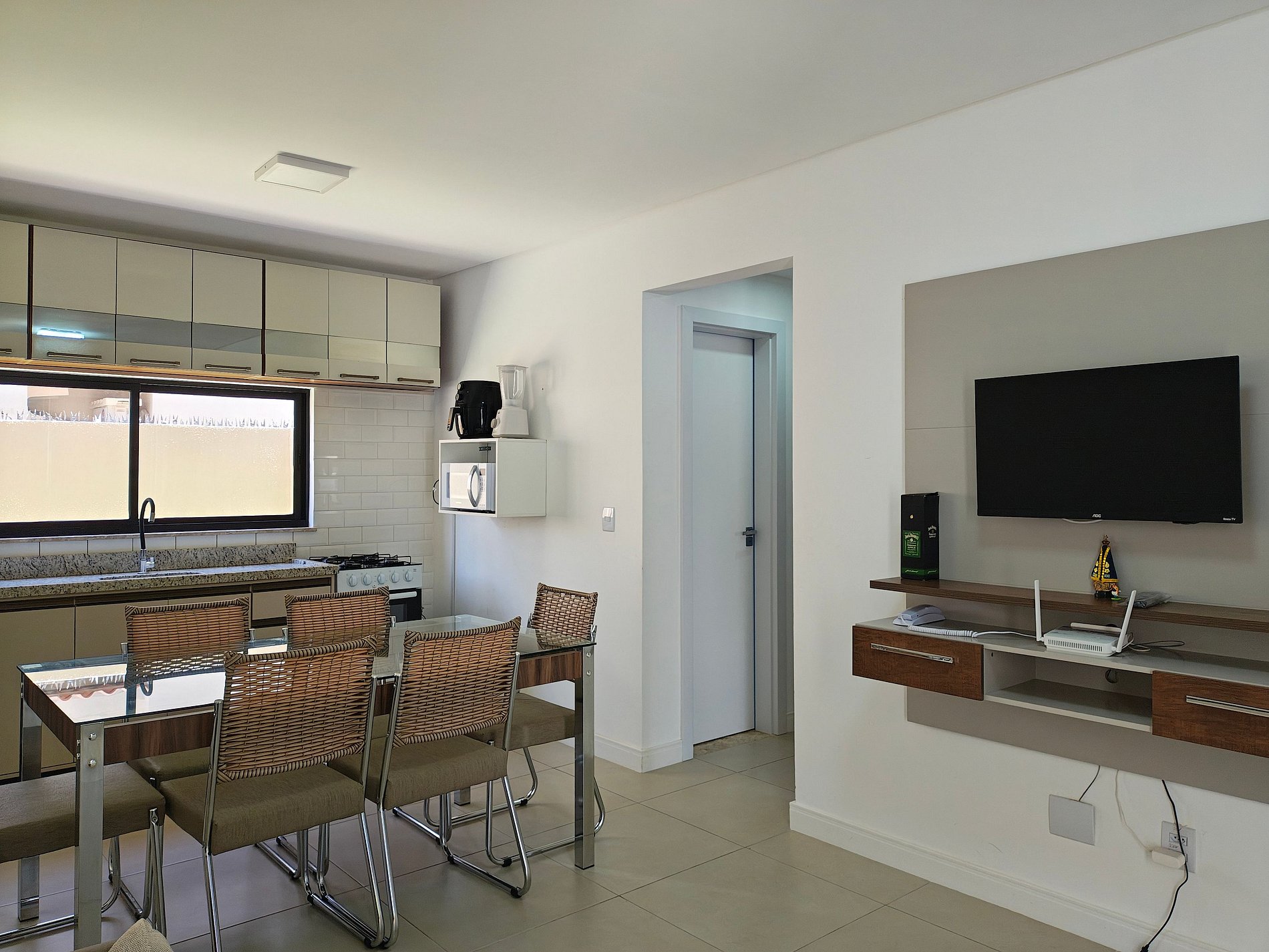 - Cozinha completa com geladeira, fogão e forno a gás, micro-ondas, Airfryer, Kit café (suporte para filtro, garrafa térmica), liquidificador, taças de vinho, panelas, louças e utensílios;