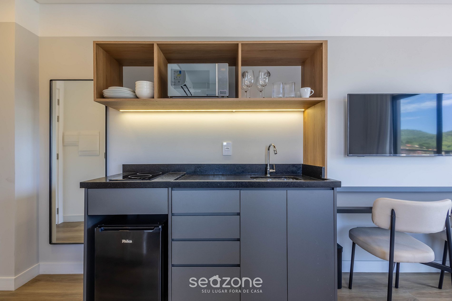 - Cozinha completa com geladeira, fogão cooktop (indução), micro-ondas, sanduicheira, cafeteira elétrica, chaleira elétrica, liquidificador, taças de vinho, panelas, louças e utensílios;