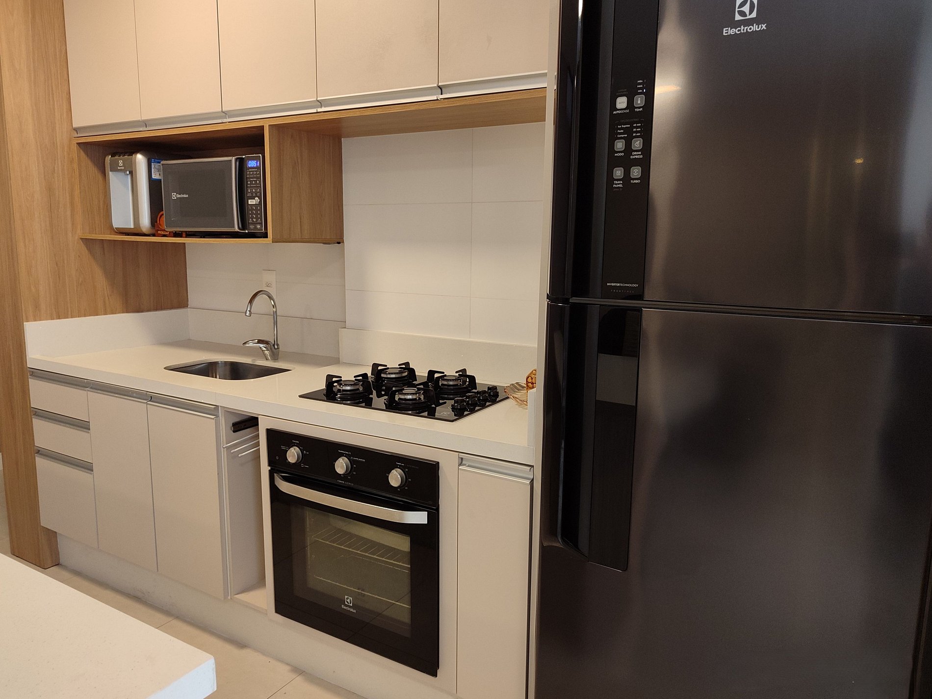 - Cozinha completa com geladeira, fogão cooktop (gás), forno elétrico, microondas, Kit café (suporte para filtro, garrafa térmica), sanduicheira liquidificador, chaleira elétrica, panelas, louças e utensílios;