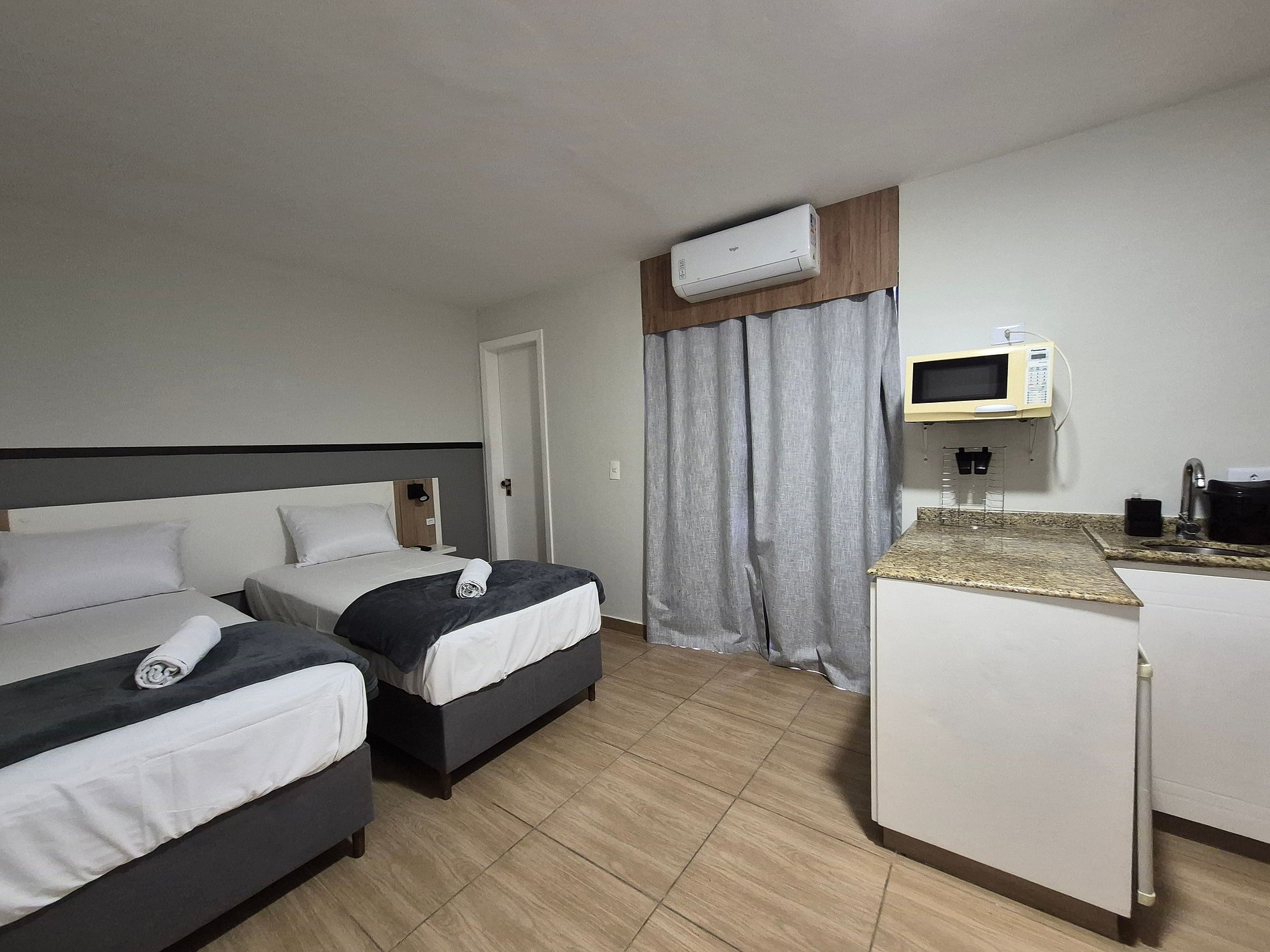 - Cozinha compacta com frigobar, micro-ondas, sanduicheira, cafeteira elétrica, chaleira elétrica, taças de vinho, louças e utensílios;