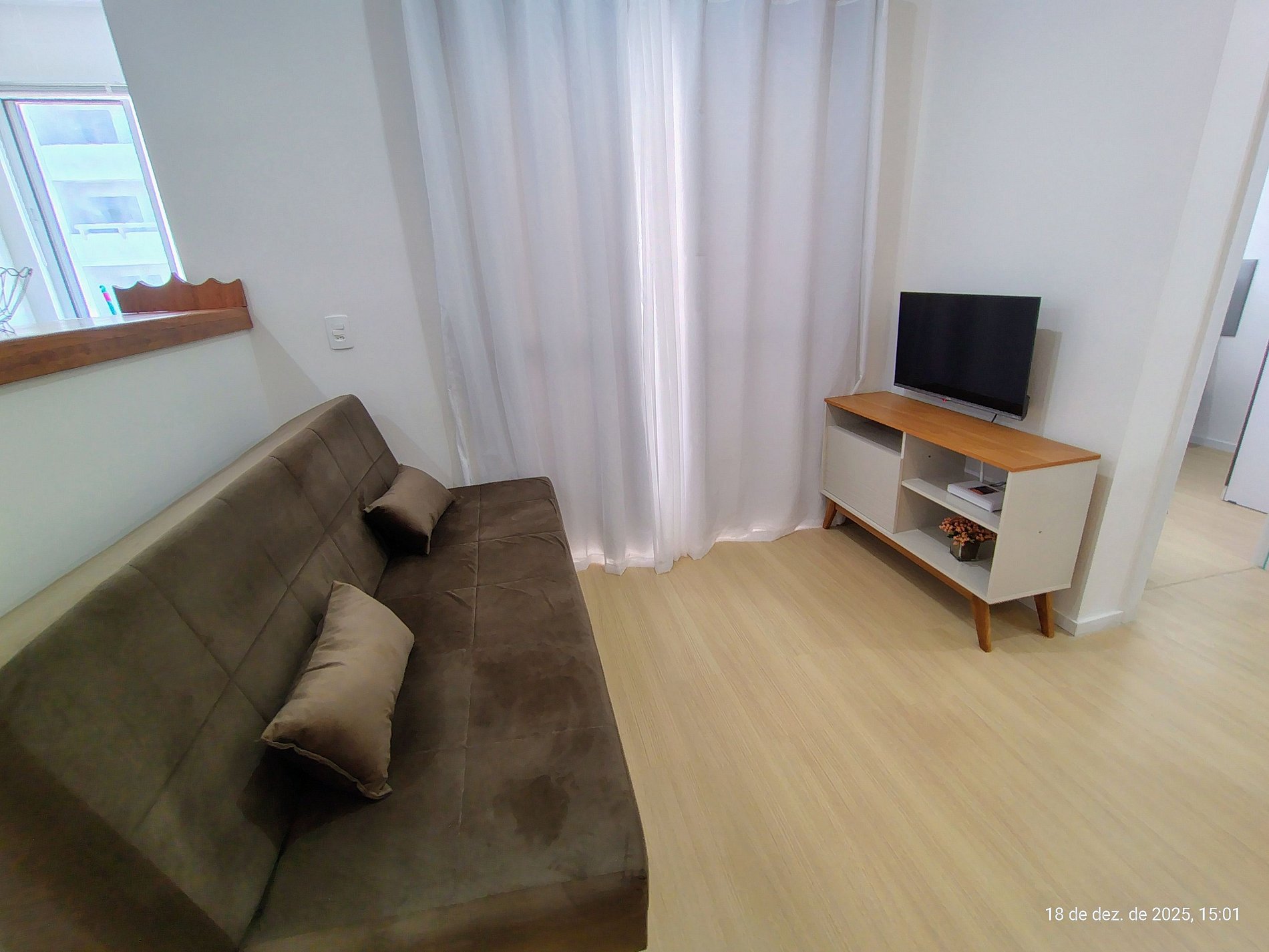 - Sala de estar com Sofá-cama de solteiro, ventilador portátil e Smart TV;