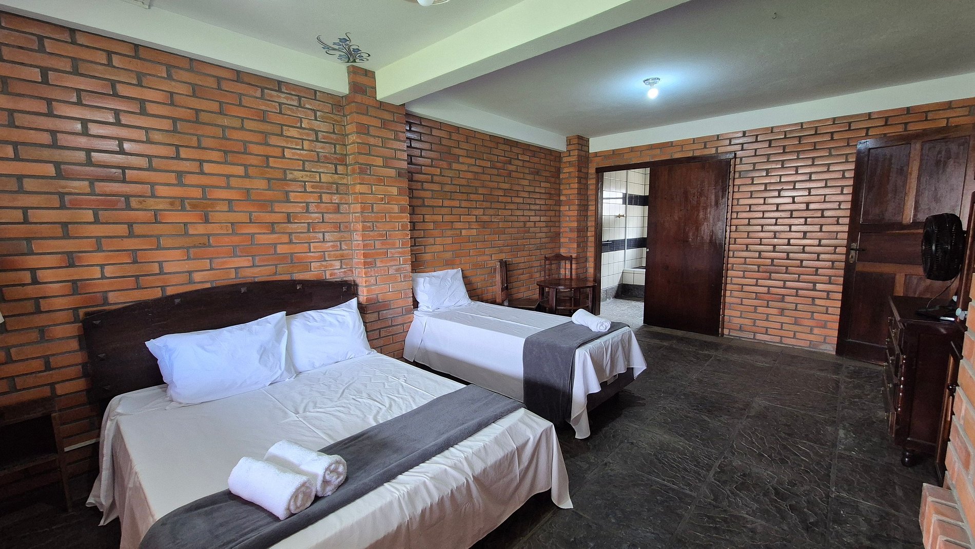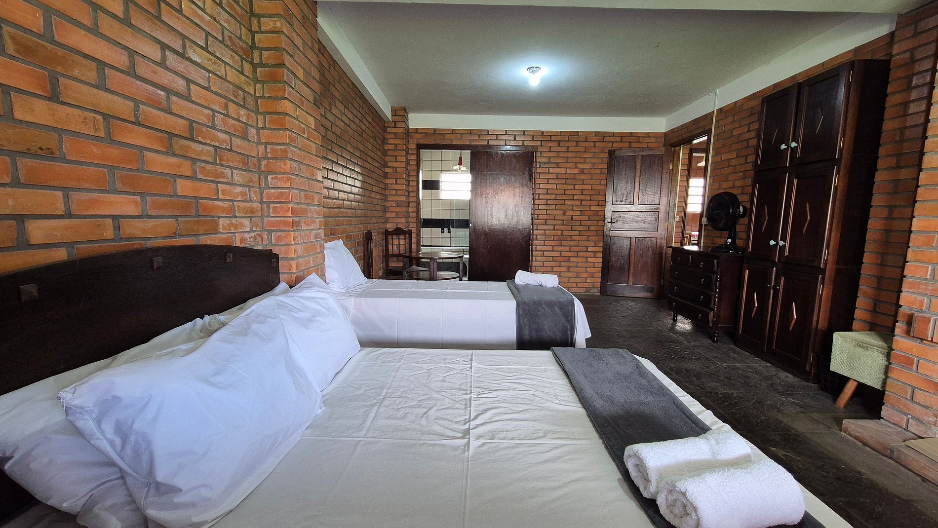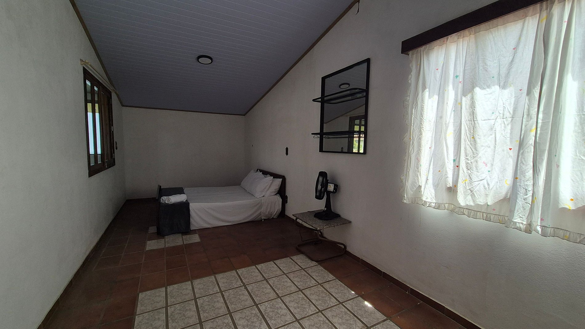 - 1 Suíte com cama casal, cama solteiro e ventilador portátil;
