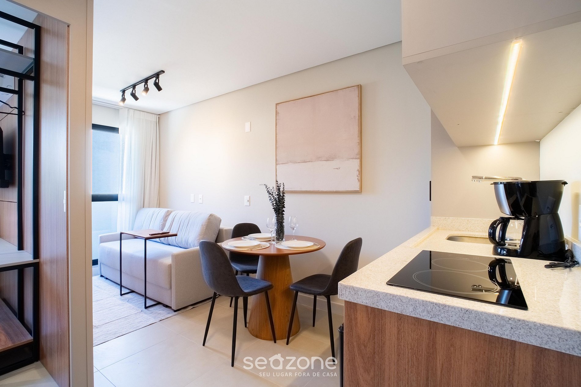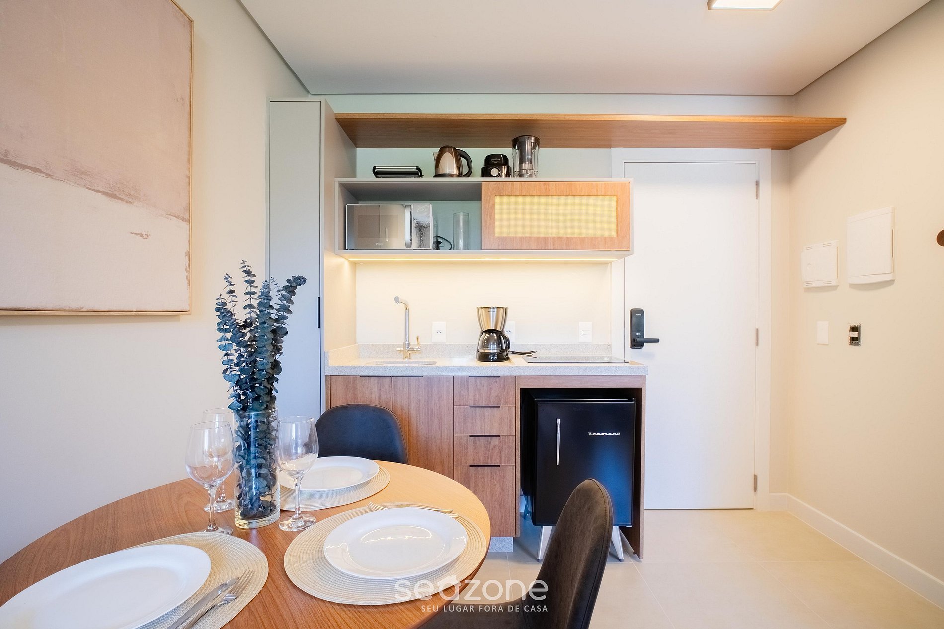 - Cozinha completa com frigobar, cooktop (indução), micro-ondas, sanduicheira, cafeteira elétrica, chaleira, liquidificador, taças de vinho, panelas, louças e utensílios;