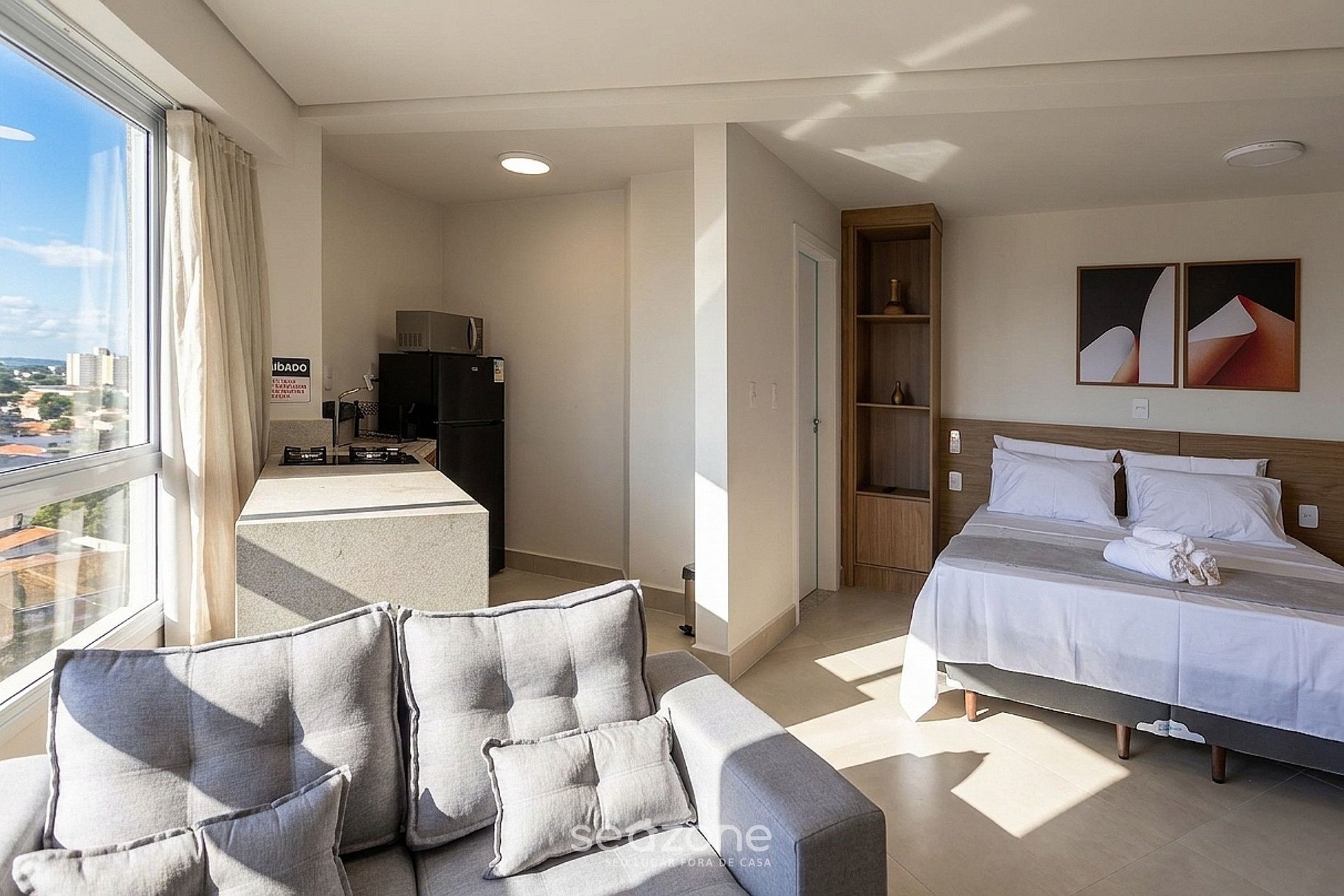 Aproveite uma estadia de qualidade neste estúdio moderno, no coração da cidade. Climatizado e com um design funcional, o espaço conta com cama de casal, cozinha completa e varanda com vista, proporcionando conforto e praticidade. O condomínio dispõe de piscina, academia e área de coworking, ideais para seus momentos de lazer ou trabalho. A localização é estratégica, com padarias, restaurantes, lanchonetes e farmácias nas proximidades.