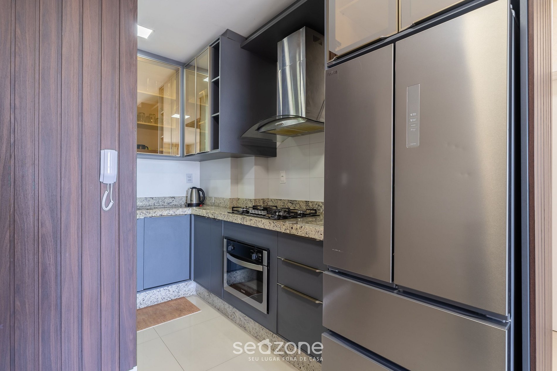 - Cozinha completa com geladeira, fogão cooktop (gás), forno elétrico, micro-ondas, sanduicheira, cafeteira elétrica, chaleira elétrica, liquidificador, taças de vinho, panelas, louças e utensílios;