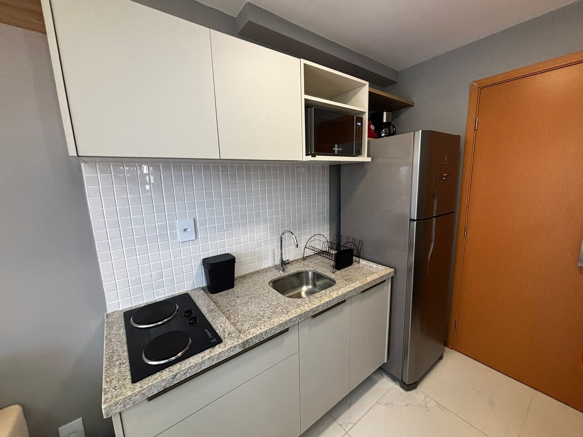 - Cozinha completa com geladeira, fogão cooktop (elétrico), micro-ondas, cafeteira elétrica, liquidificador, taças de vinho, panelas, louças e utensílios;