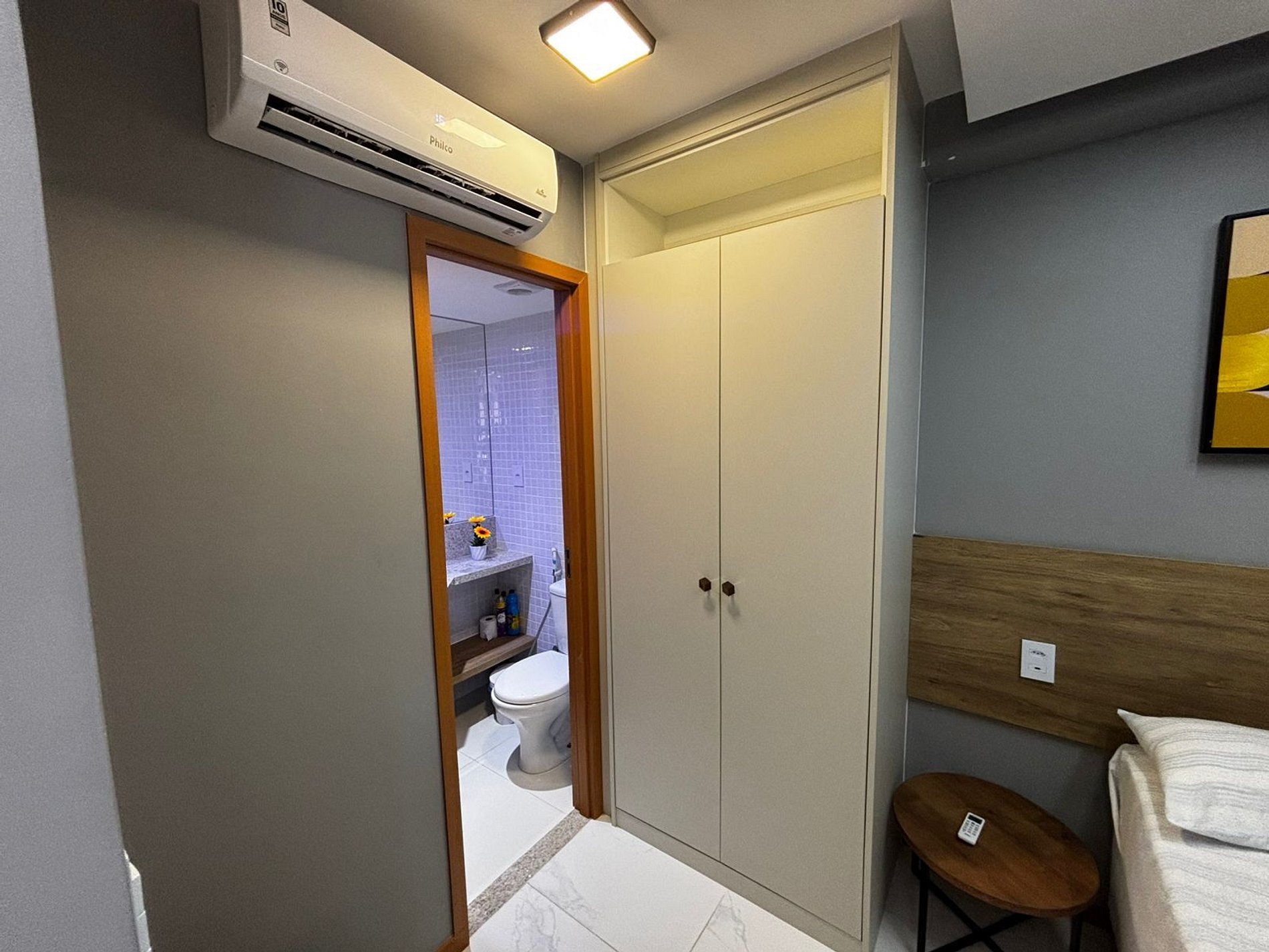 - 1 Suíte com cama de casal, armário e ar-condicionado;