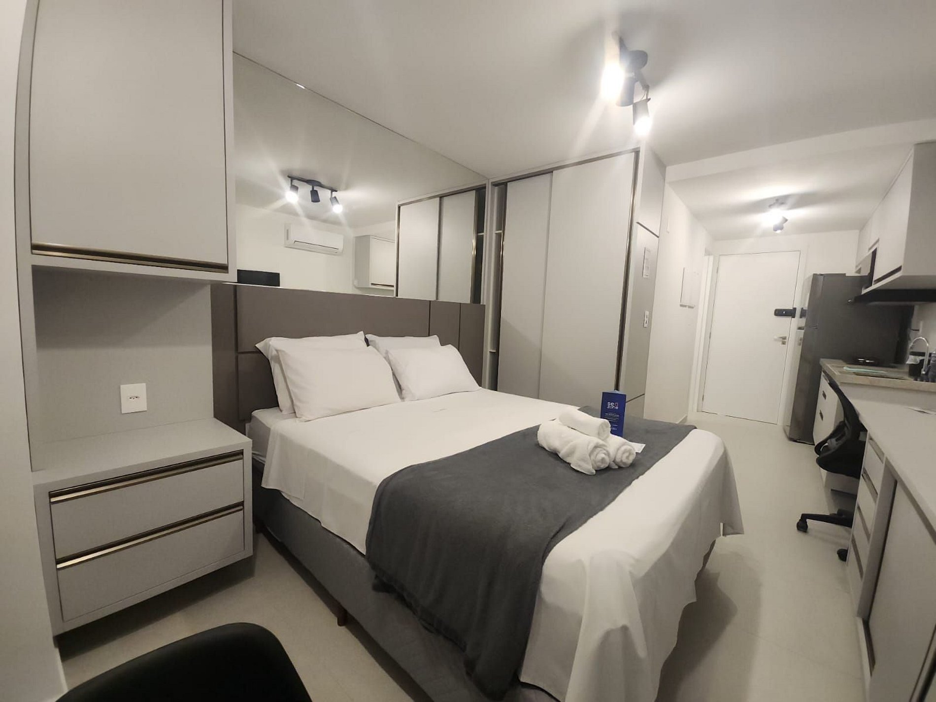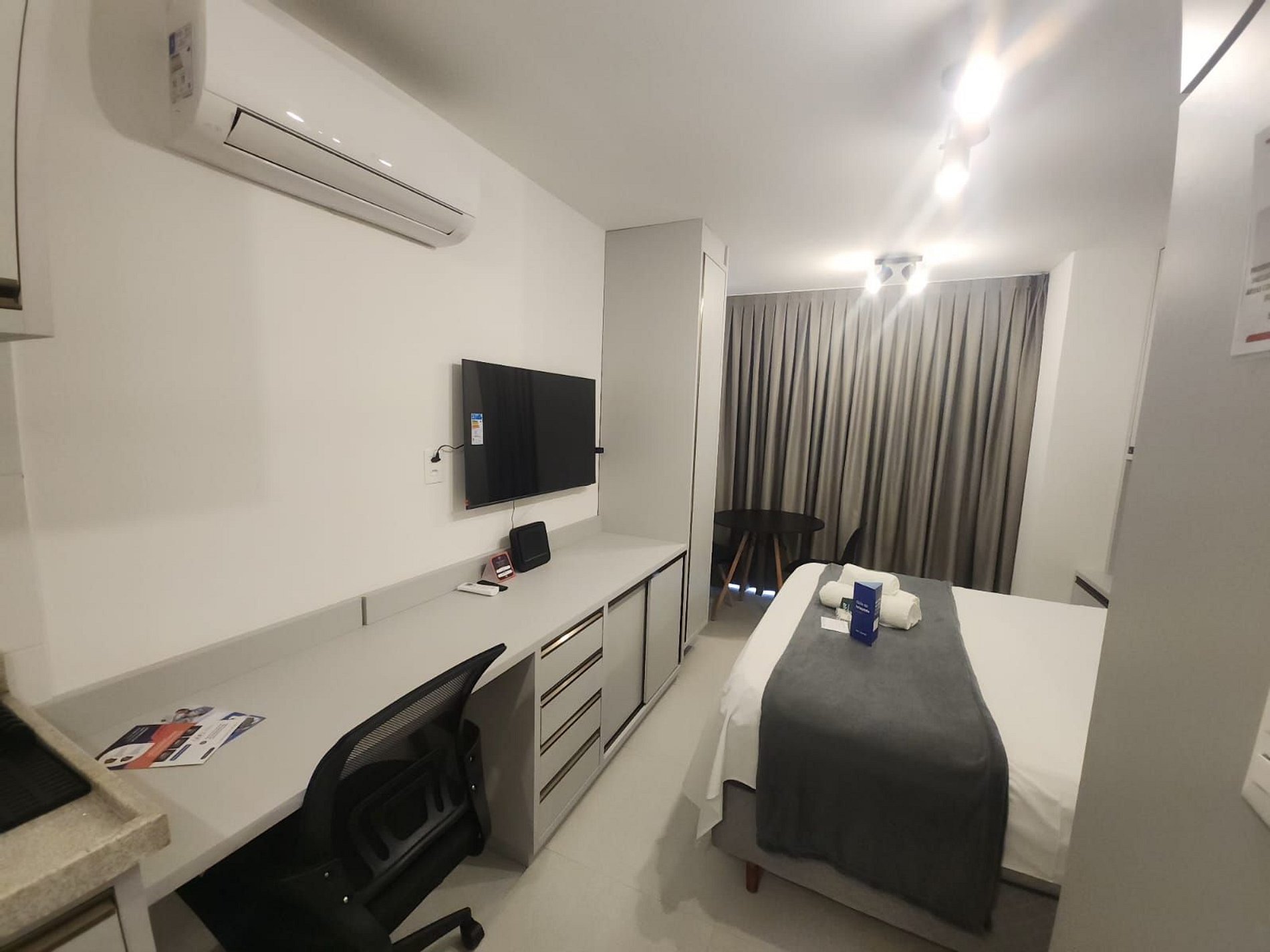 - Cama de casal, Smart TV, armário, espaço para uso de notebook, e ar-condicionado;