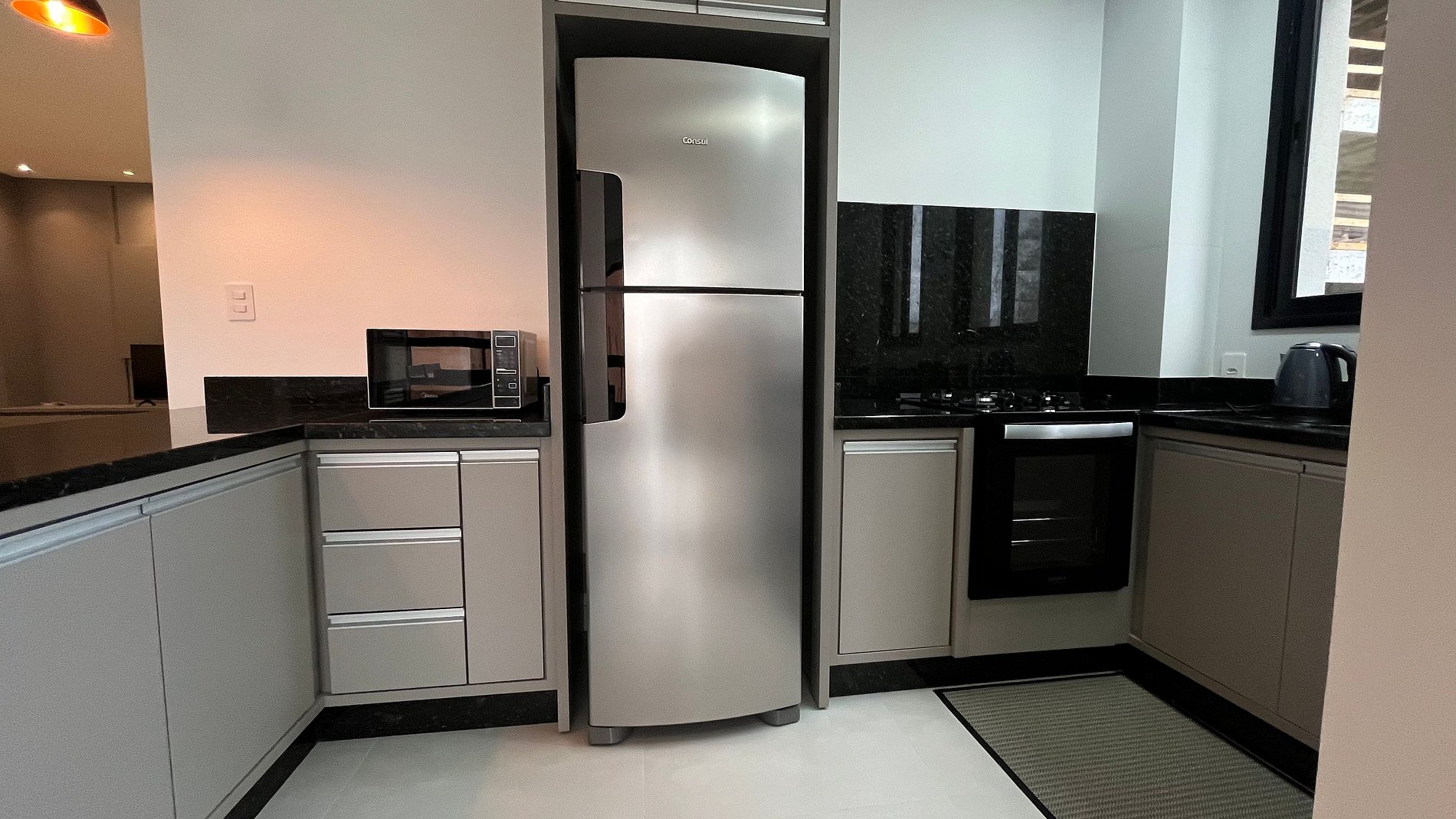 - Cozinha completa com, geladeira, fogão cooktop a gás, forno a gás, micro-ondas, sanduicheira, Kit café (suporte para filtro, garrafa térmica), chaleira elétrca, liquidificador, taças de vinho, panelas, louças e utensílios;
