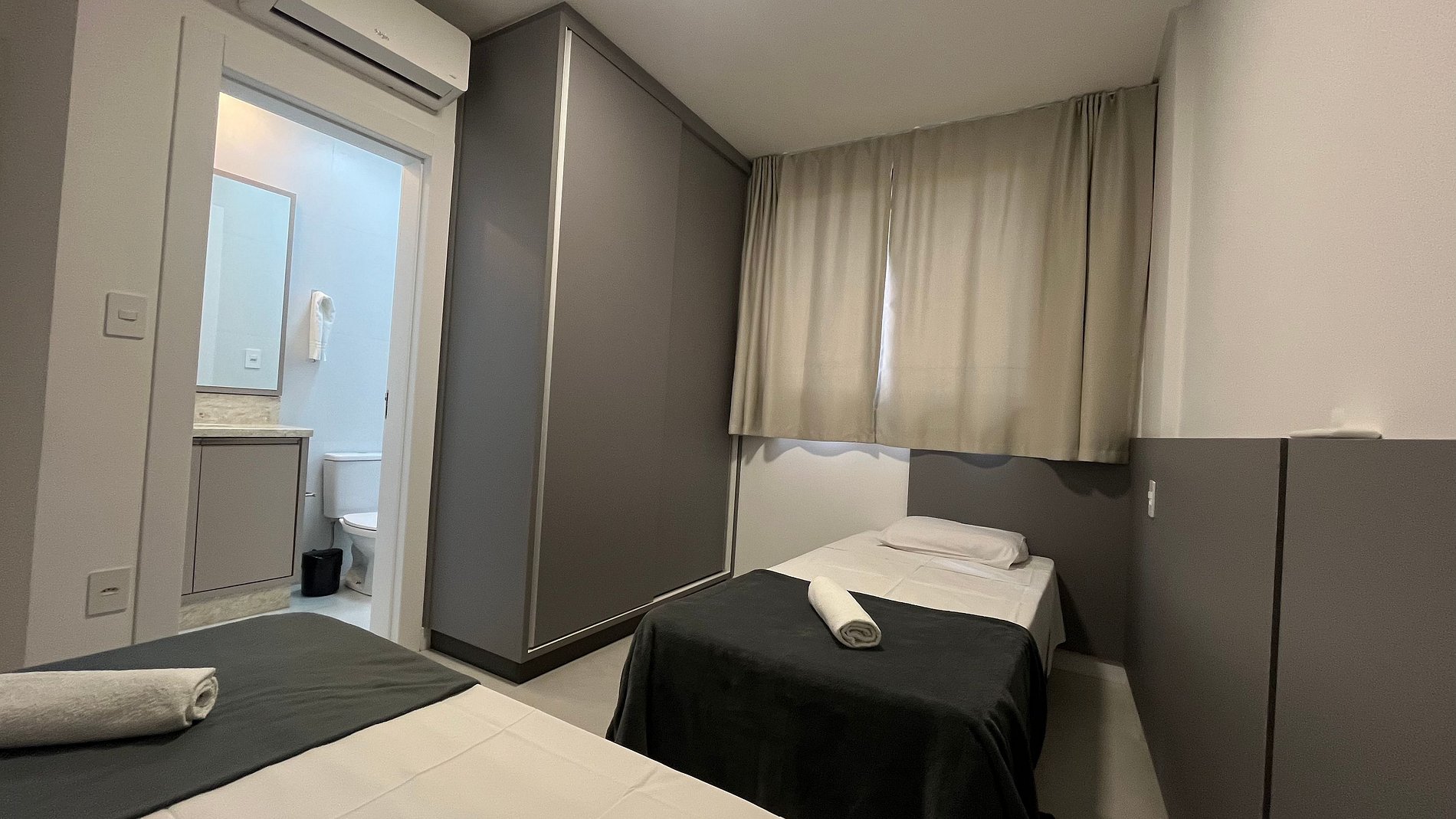 - 1 Suíte com 2 camas de solteiro, armário, cortinas com black-out e ar-condicionado;