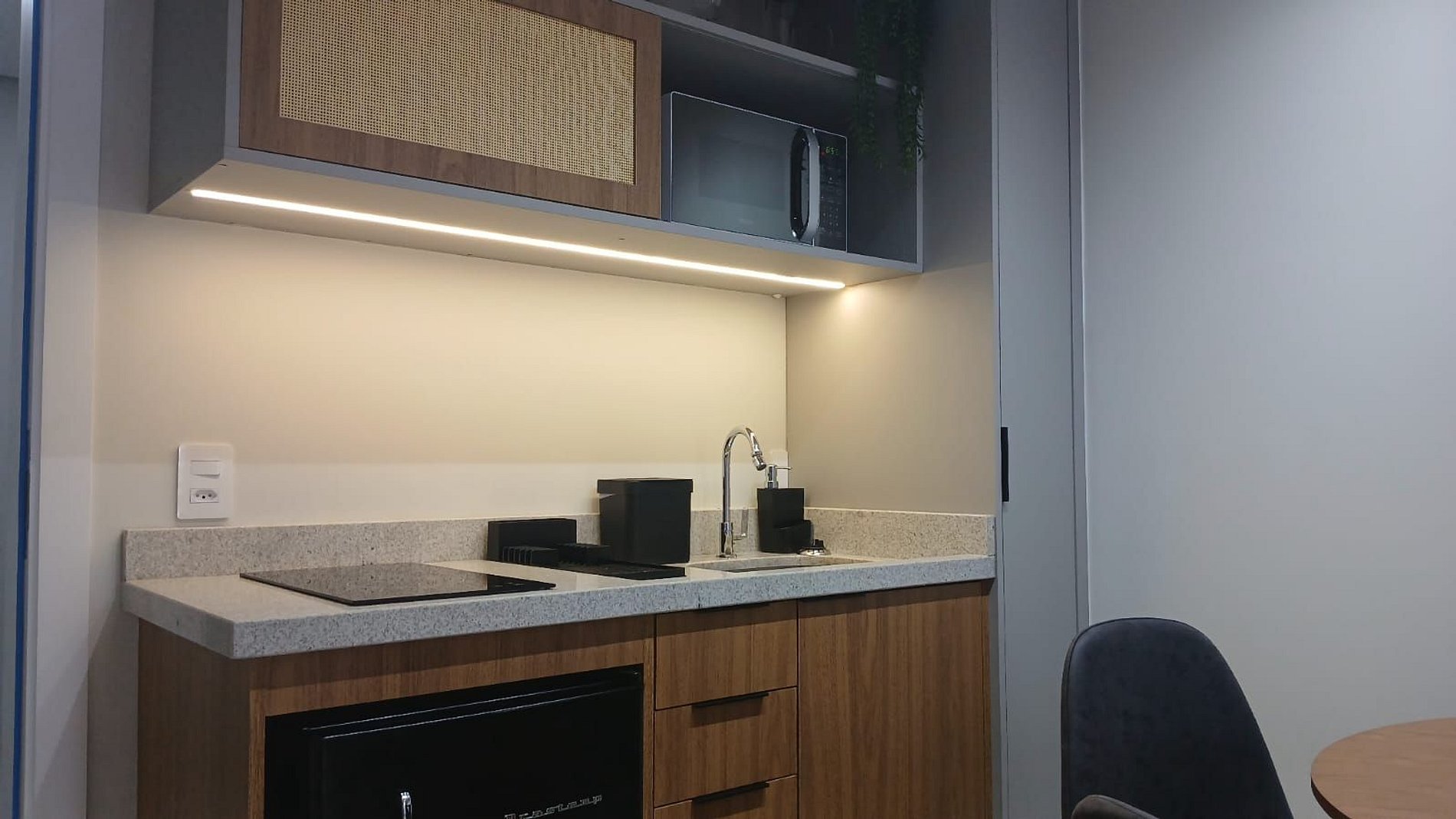- Cozinha completa com frigobar, cooktop por indução, micro-ondas, sanduicheira, cafeteira elétrica, chaleira elétrica, liquidificador, taças de vinho, panelas, louças e utensílios;