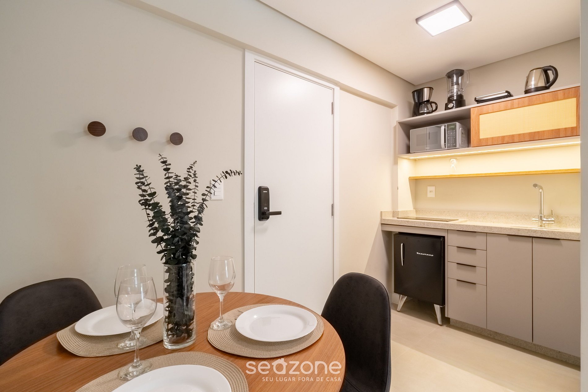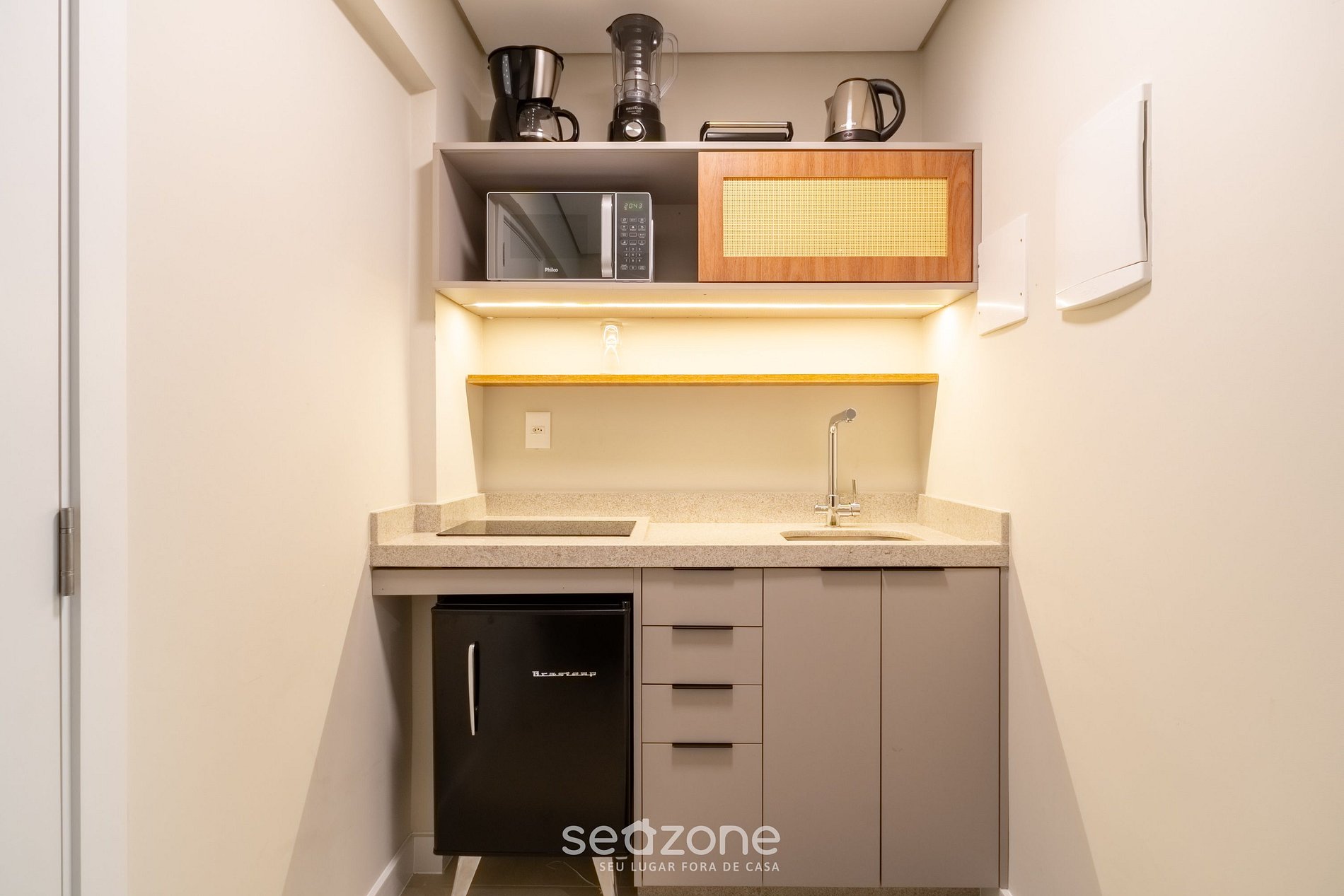 - Cozinha completa com frigobar, cooktop por indução, micro-ondas, sanduicheira, cafeteira elétrica, chaleira, liquidificador, taças de vinho, panelas, louças e utensílios;